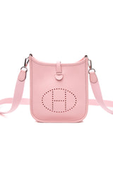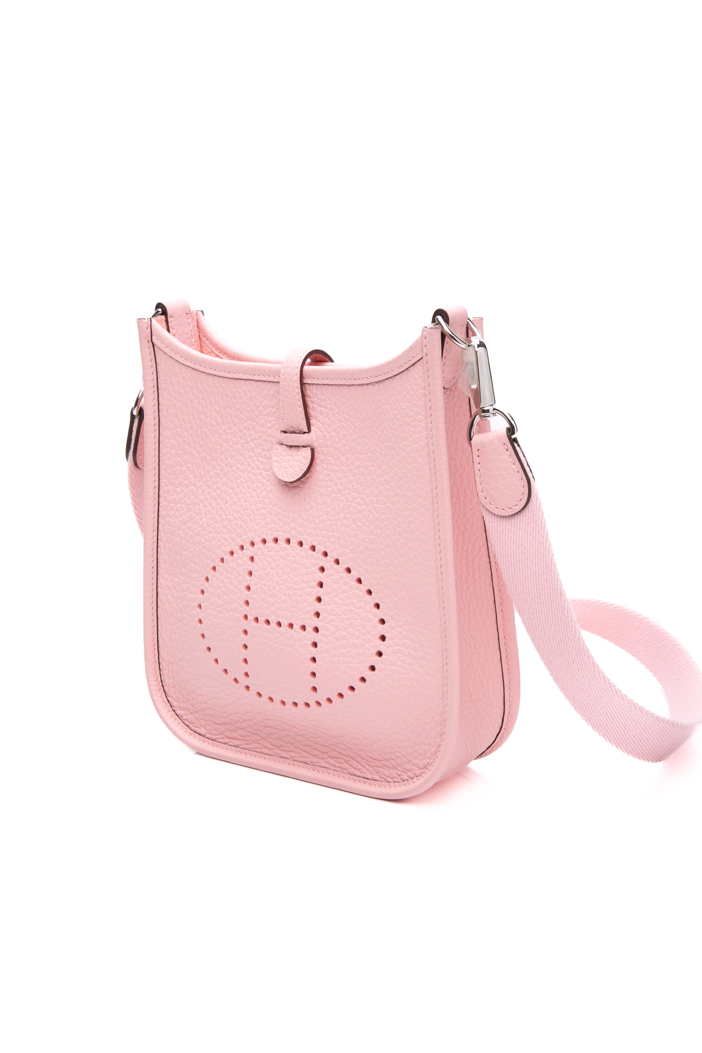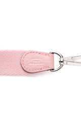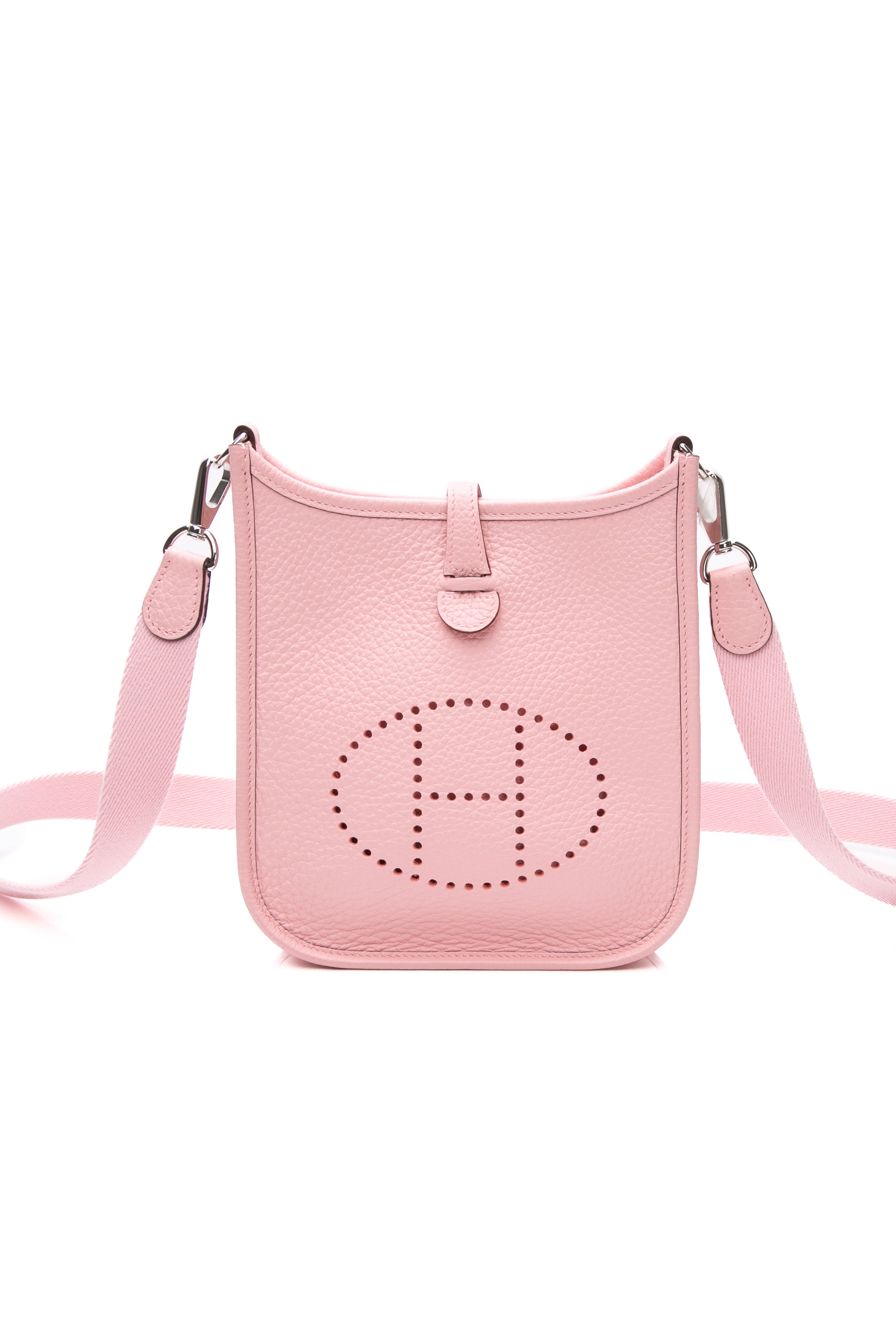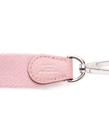 This petite crossbody bag has a classic messenger shape and is crafted of pebbled taurillon calfskin leather in Rose Sakura, with a perforated Hermes H oval logo on the front. The bag features canvas crossbody strap with palladium hardware. The top opens with a small cross over strap and snap to a matching suede interior.