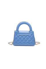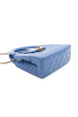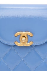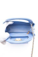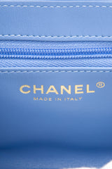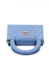 This mini bag is a twist on an archival Chanel bag, featuring a long crossbody chain strap. This dual top handle bag is quilted in shiny aged calfskin leather in blue, accented by aged gold hardware, including a Chanel CC turn-lock at the flap. This opens to a compact matching leather interior with zipper and flat pockets.