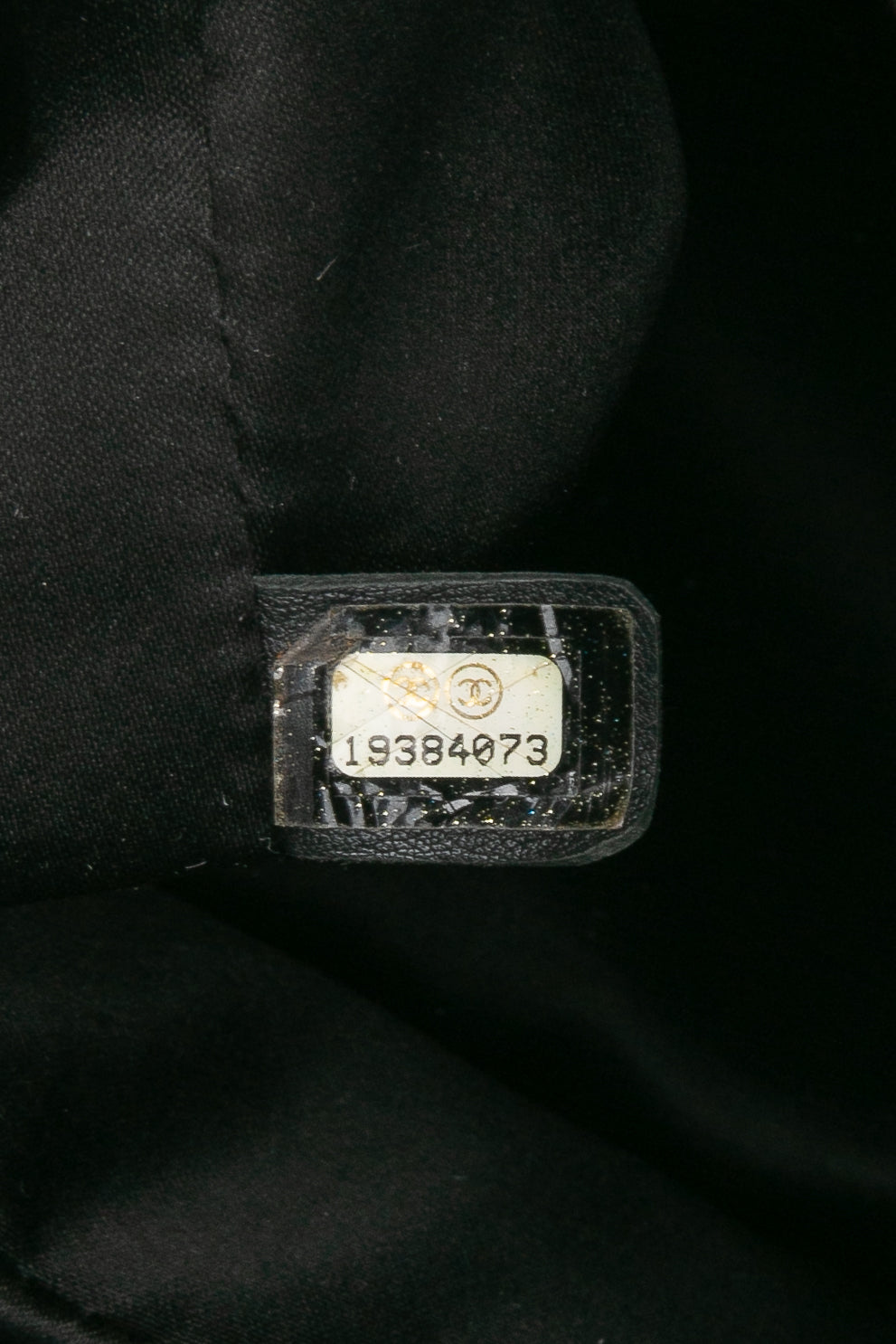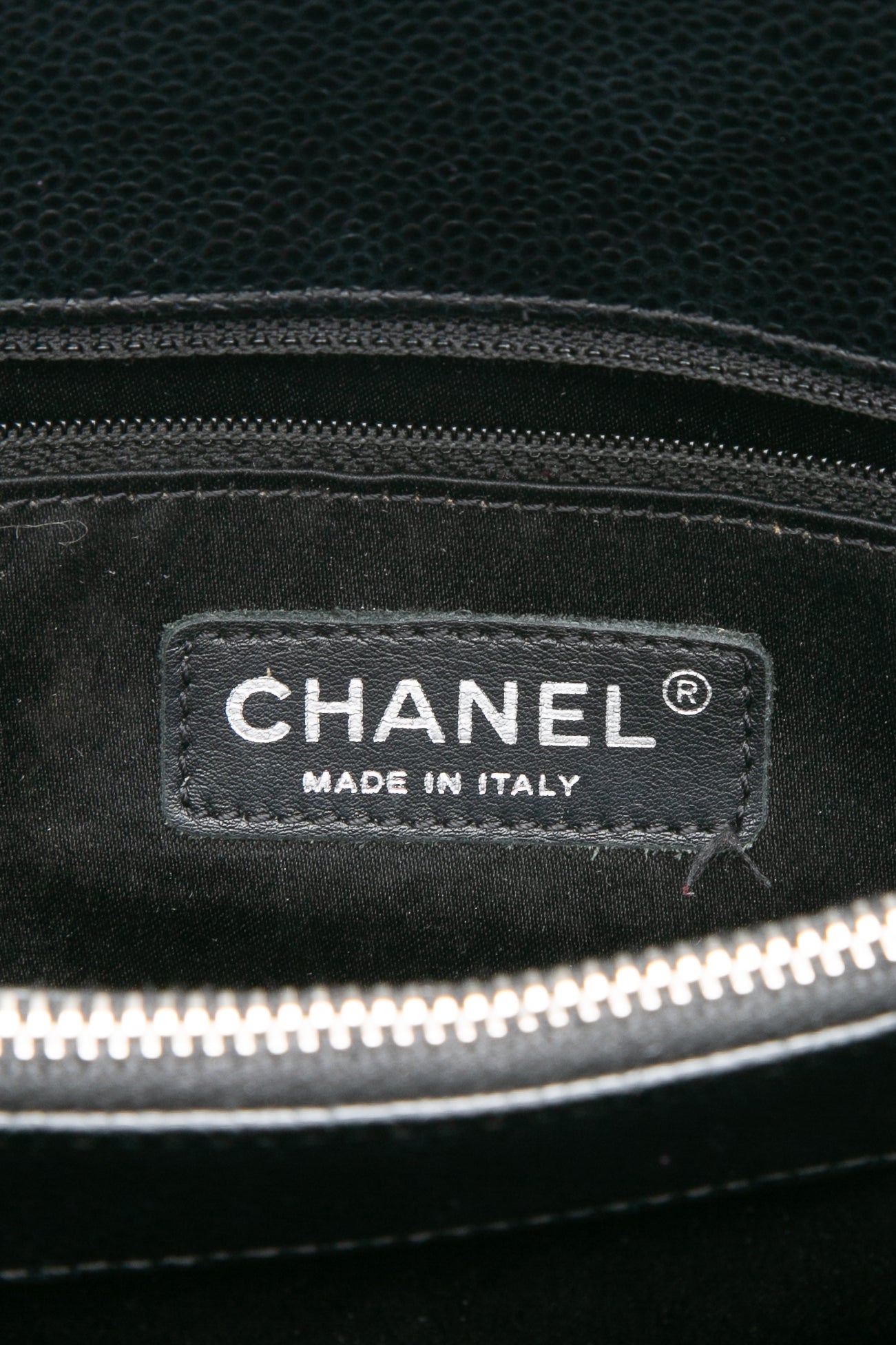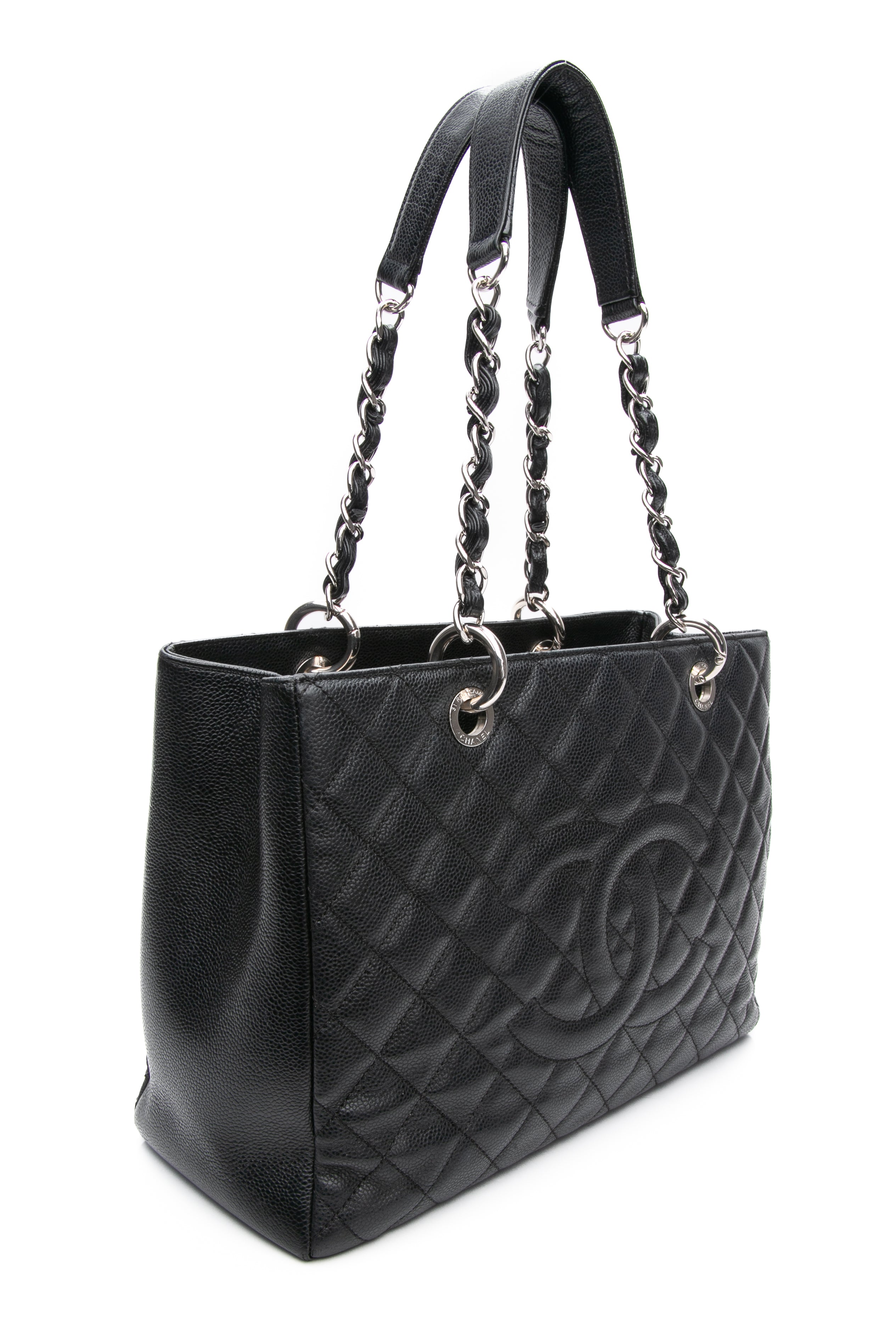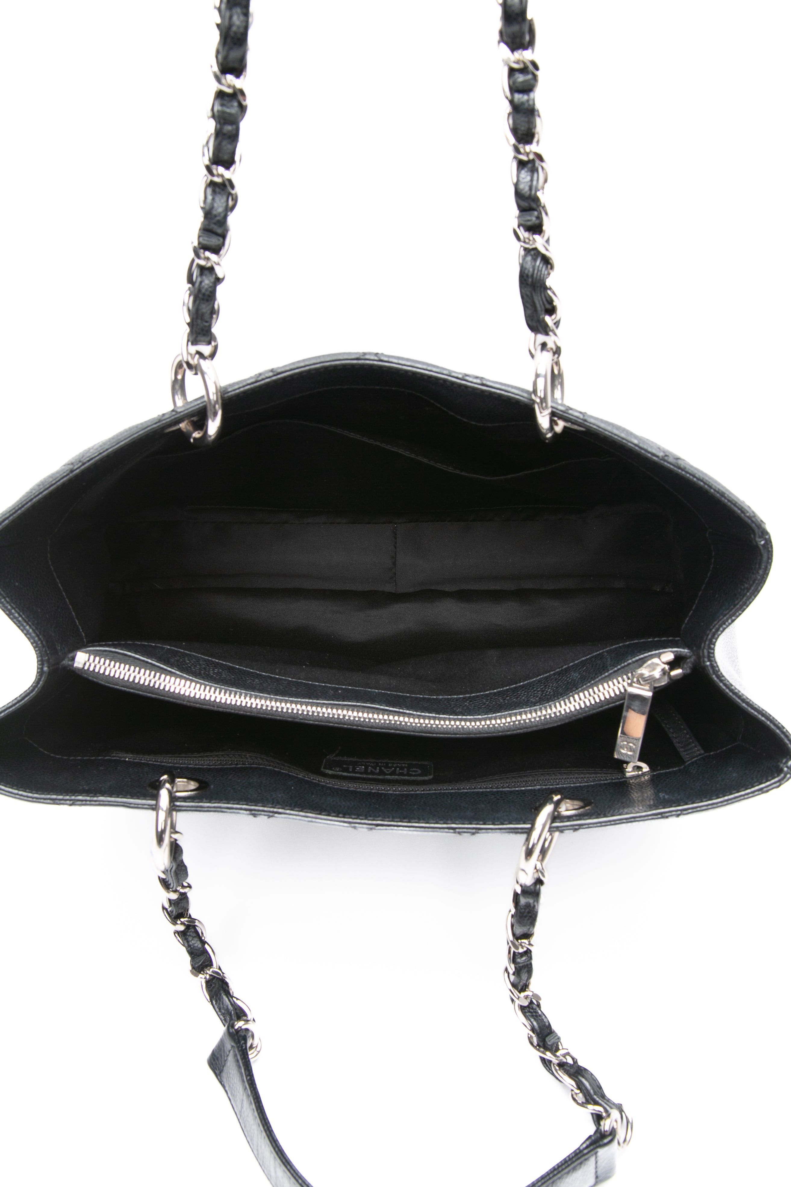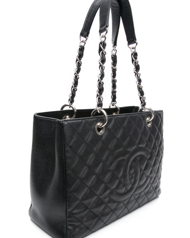 This stylish tote is crafted of diamond quilted caviar leather in black. The bag features leather threaded silver chain-link shoulder straps with leather shoulder pads, a prominent quilted Chanel CC logo on the front, and a rear patch pocket. The top is open to a partitioned black satin interior with a central zipped compartment, and additional pockets.