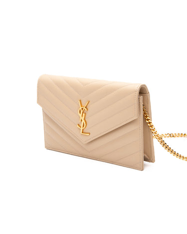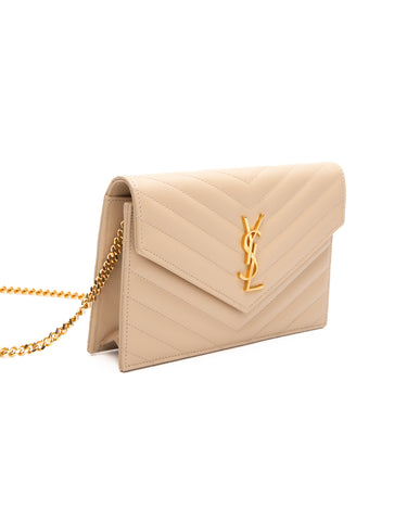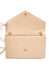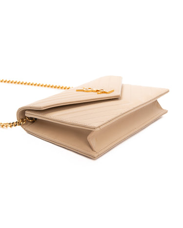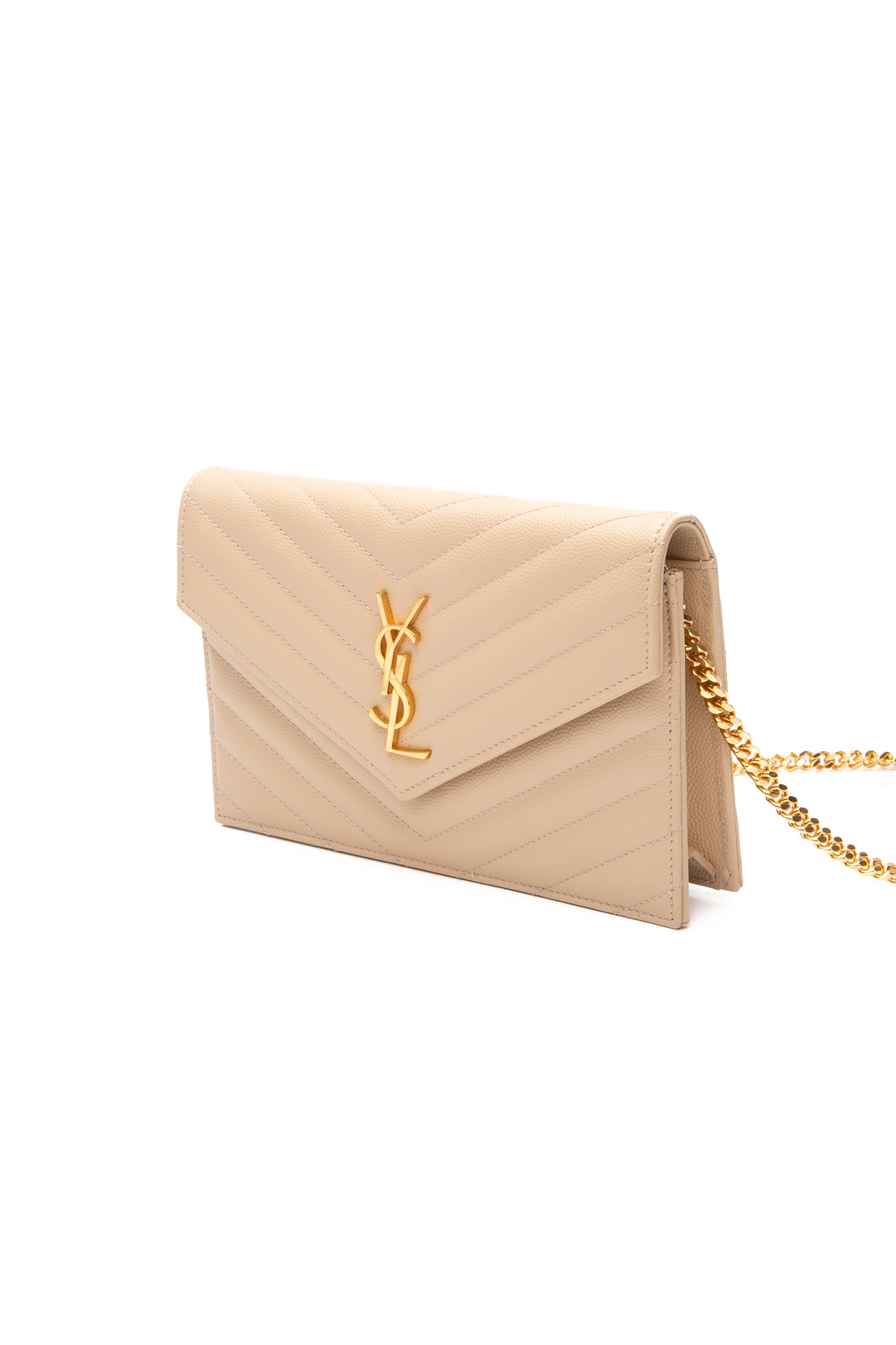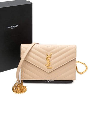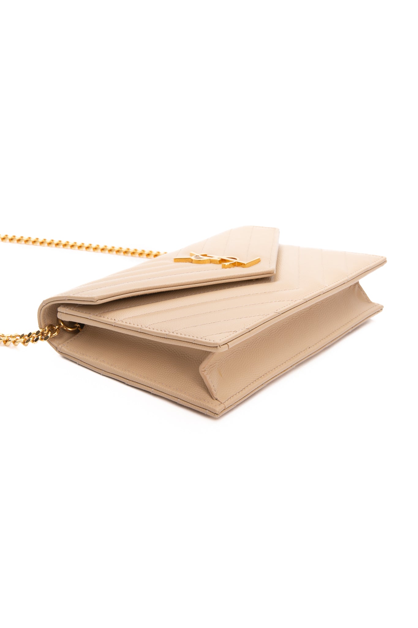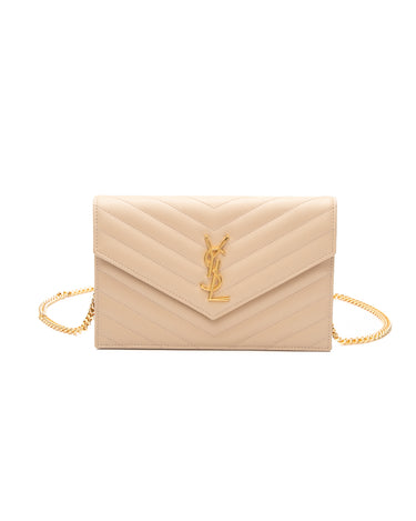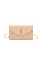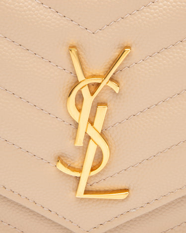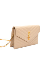 SAINT LAURENT Dark Beige Cassandre Envelope Chain Wallet in Grain de Poudre Leather