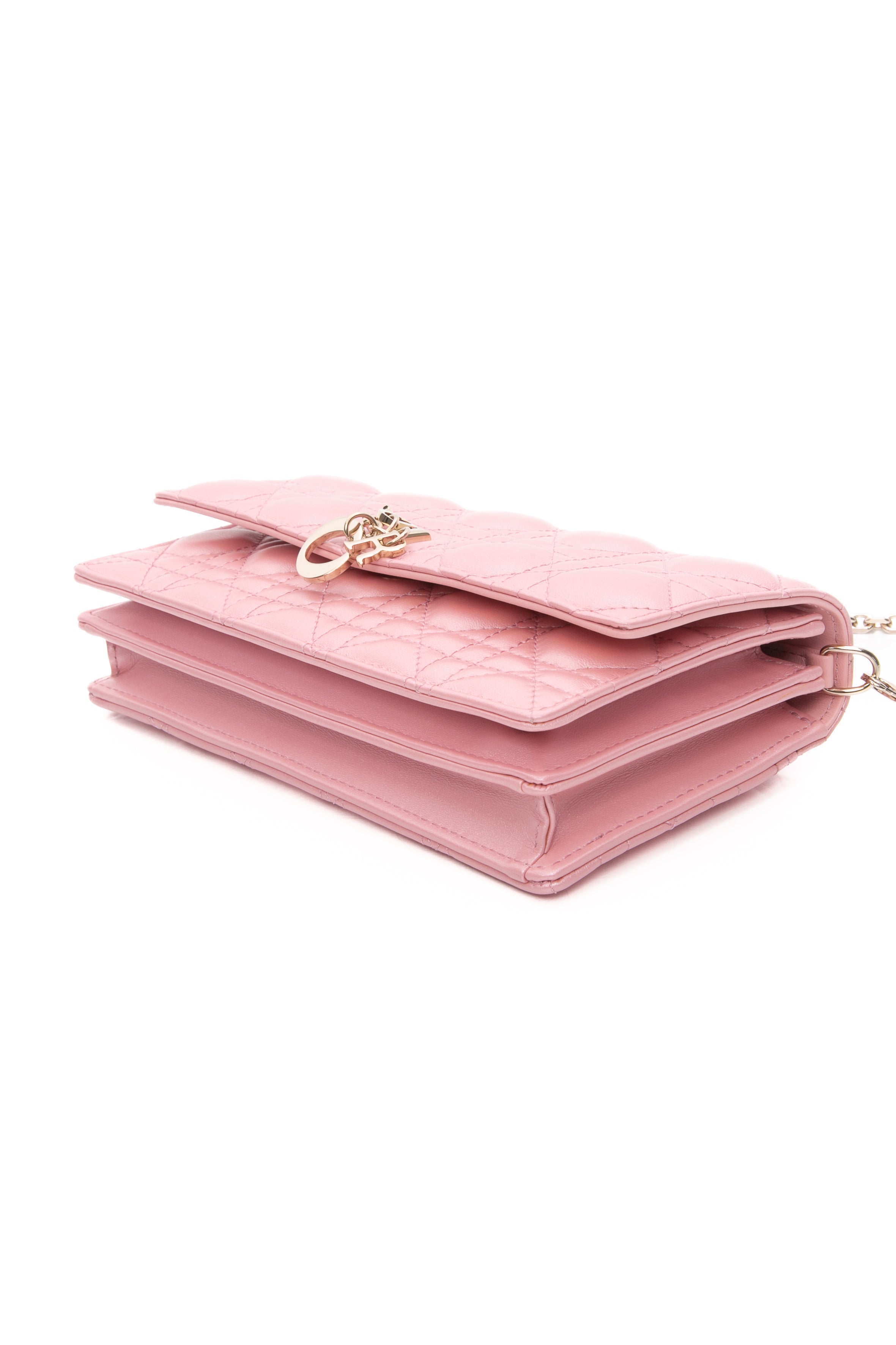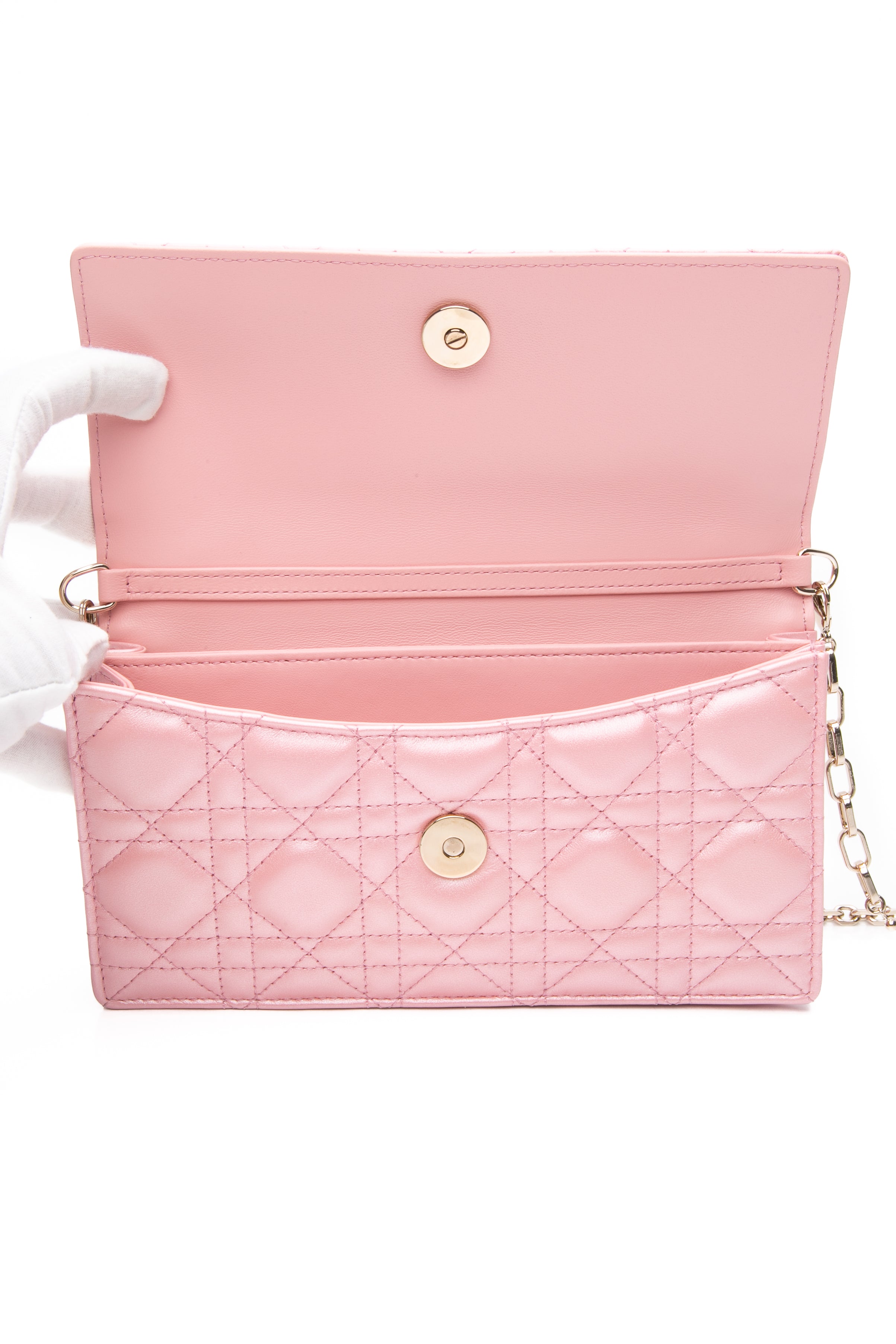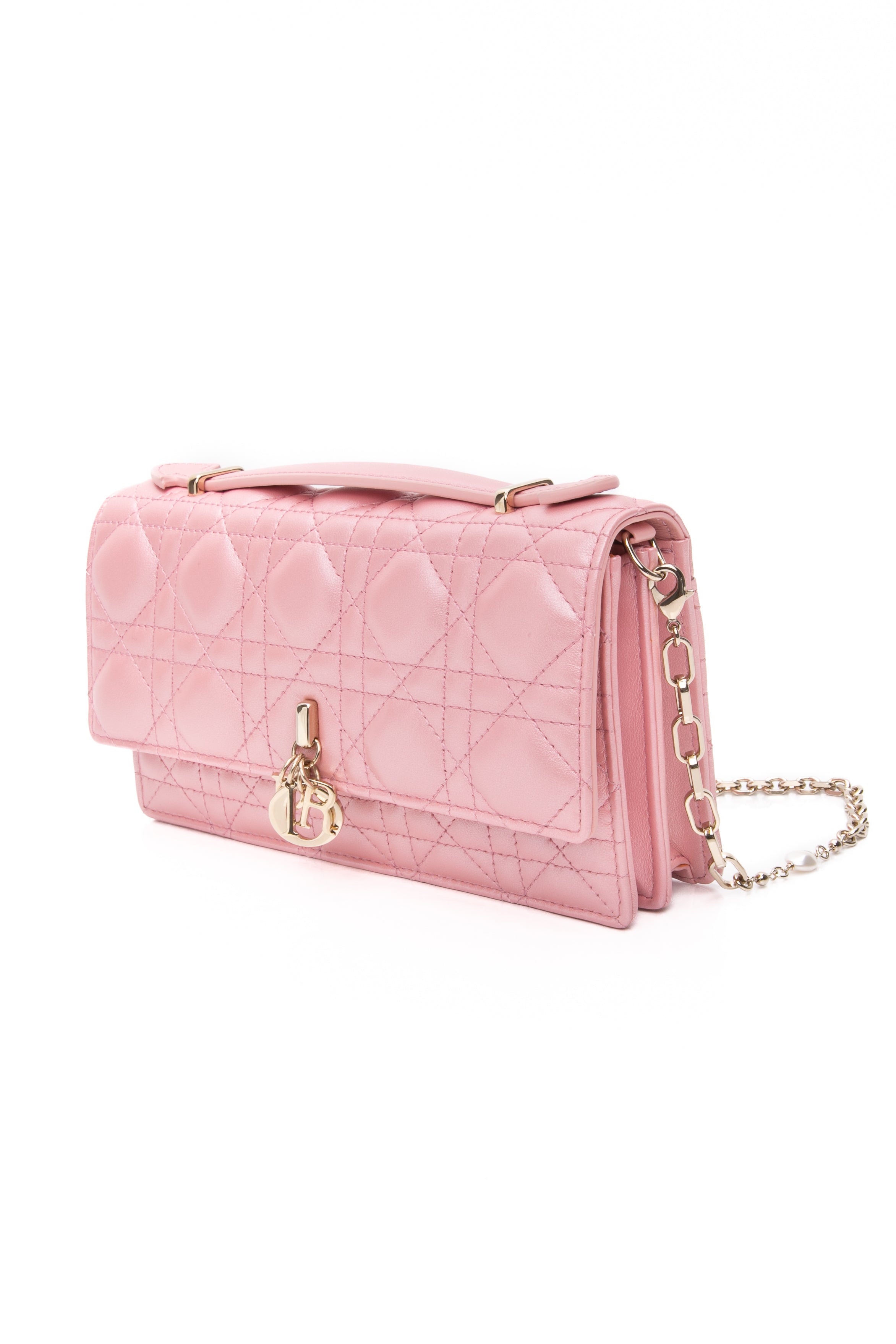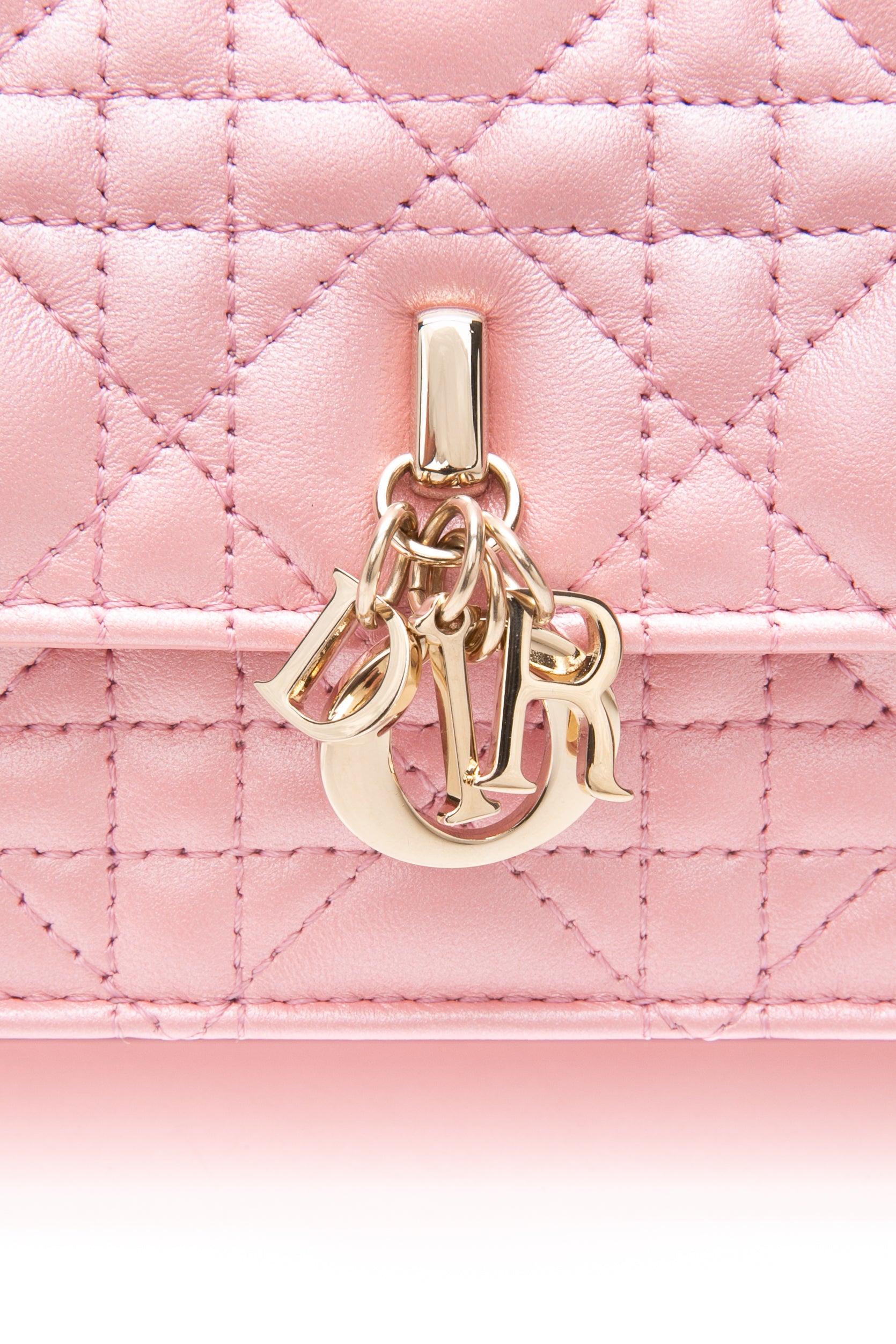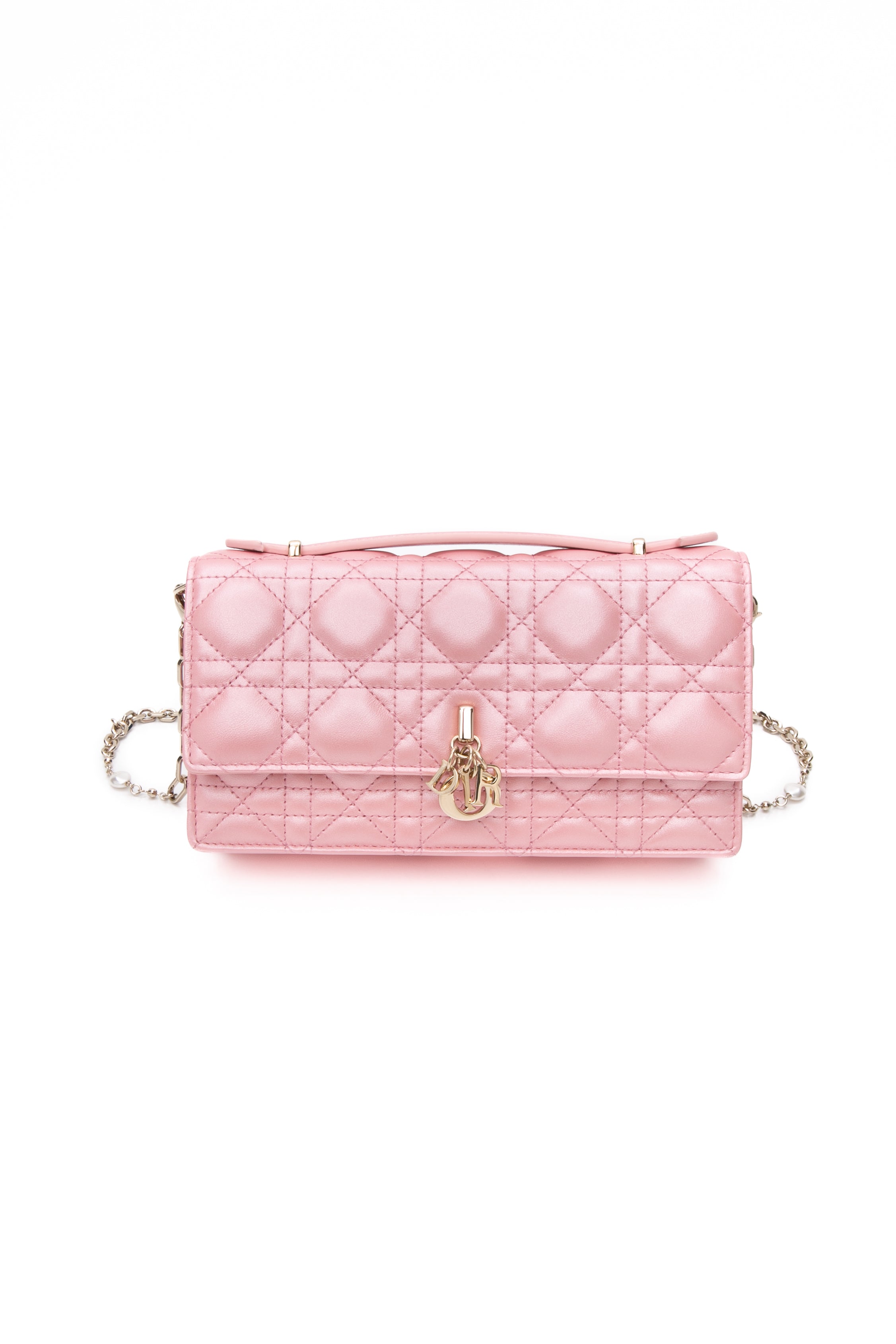 The My Dior mini bag elevates the line with an elegant and functional design. Crafted in Powder Pink Iridescent lambskin, it features a flap enhanced by D.I.O.R. charms on the front. Equipped with compartments and card slots, the functional accessory holds all the essentials and is the ideal day and evening companion. A top handle completed by a removable chain punctuated with resin pearls allows the bag to be carried by hand or worn crossbody.