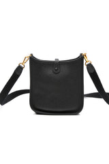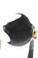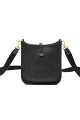 This petite crossbody bag has a classic messenger shape and is crafted of pebbled clemence leather in black color, with a perforated Hermes H oval logo on the front. The bag features canvas crossbody strap with gold tone hardware. The top opens with a small cross over strap and snap to a matching suede interior.