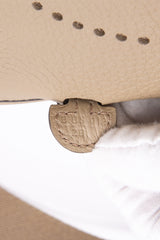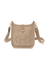 This petite crossbody bag has a classic messenger shape and is crafted of pebbled clemence leather in Beige Marfa color, with a perforated Hermes H oval logo on the front. The bag features canvas crossbody strap with gold tone hardware. The top opens with a small cross over strap and snap to a matching suede interior.