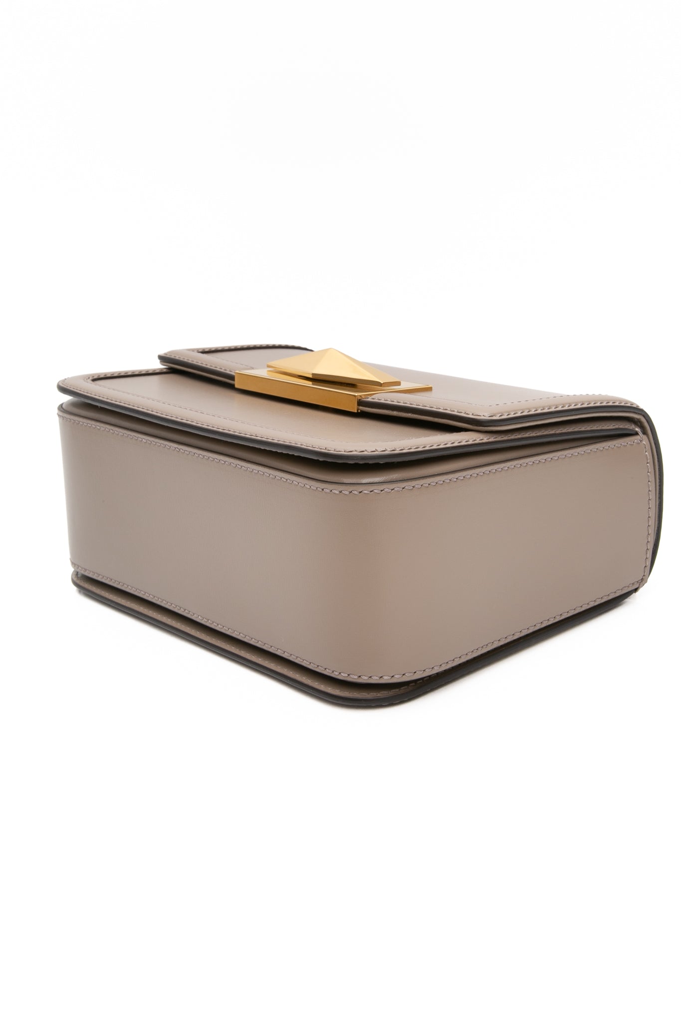 Diamond top handle bag is crafted from box calf leather and features a top handle and detachable shoulder strap. It is completed with a gold tone push lock closure and the brand's signature logo. It can be worn as a shoulder bag, top handle bag, or crossbody bag.