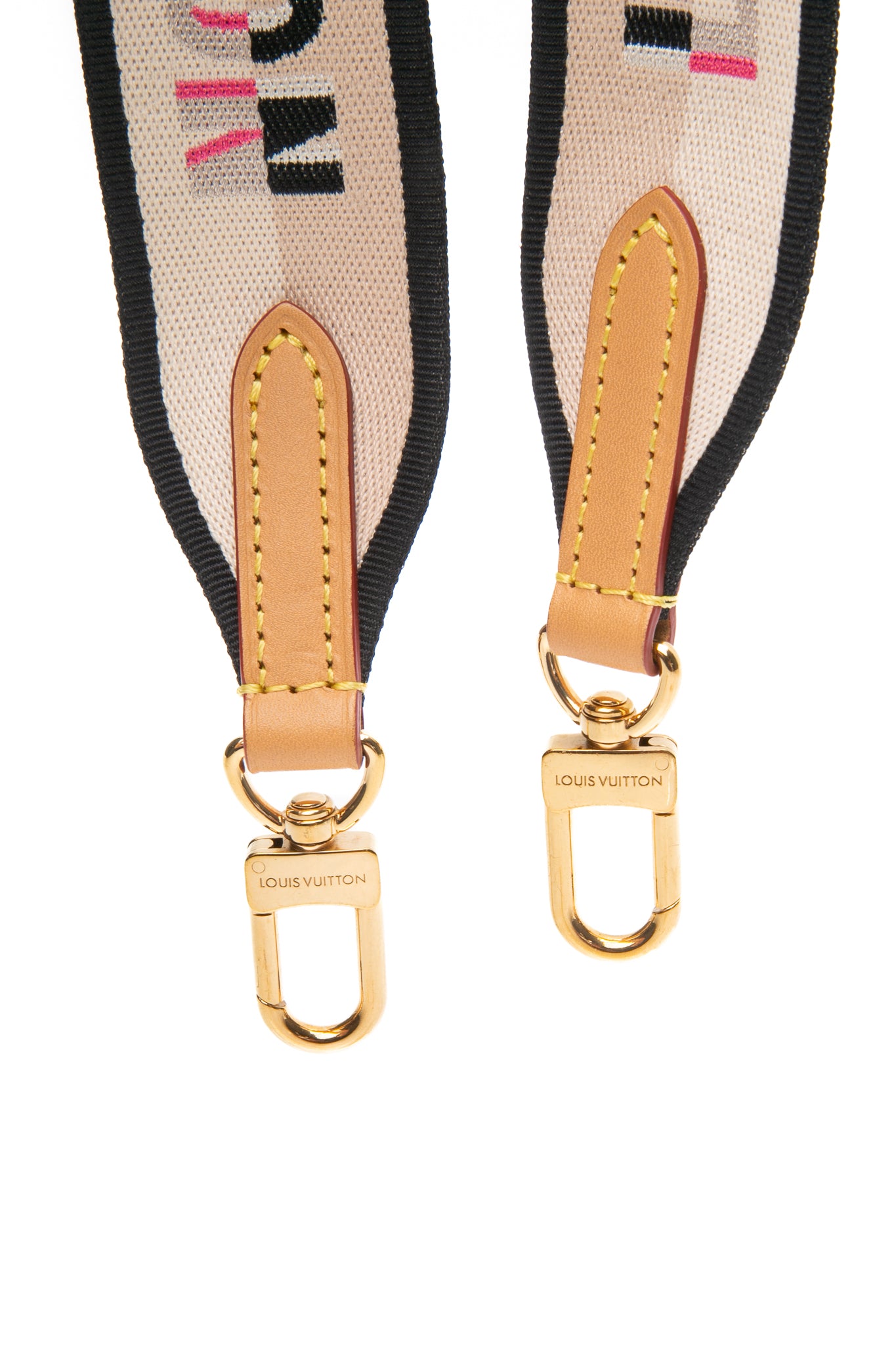 This strap is crafted of canvas with the Louis Vuitton Paris logo embroidered throughout. It has vachetta leather ends and a polished brass clasp at each end.