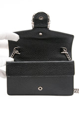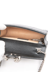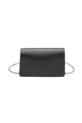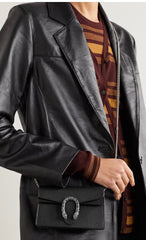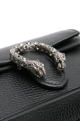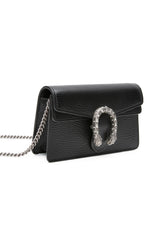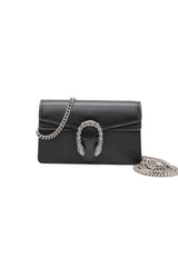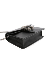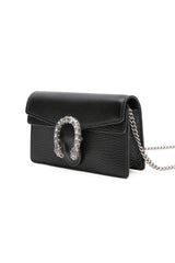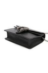 A structured leather chain super mini bag with a key ring that can be used to attach this bag to a separate larger bag. The closure has the textured tiger head spur closure-a unique detail referencing the Greek god Dionysus, who in myth is said to have crossed the river Tigris on a tiger sent to him by Zeus. The tiger head closure is enriched with Swarovski crystal stones.