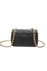 This crossbody features a black diamond quilted lambskin leather and aged gold hardware. The crossbody shoulder strap features a long gold chain with a leather shoulder pad. The front features a full flap that opens with a CC turn lock to a matching leather interior and a patch pocket.