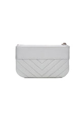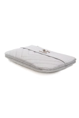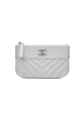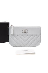 This petite case is crafted of chevron quilted leather in silver and features a faux CC turn lock in silver with grey enamel inlay. The top zipper opens to a grey fabric interior.