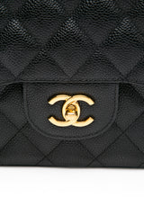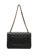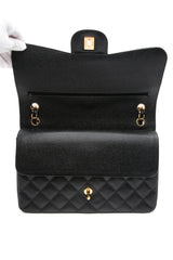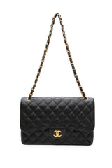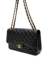 This Jumbo Classic Double Flap bag is in black caviar leather with gold tone hardware and features a front flap with signature CC turn lock closure, half moon back pocket, and adjustable interwoven gold tone chain link and black leather shoulder strap.