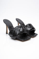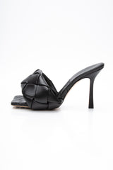 These stunning sandals are a size 38 and are crafted of woven lambskin leather in black and feature an elongated square open toe.
