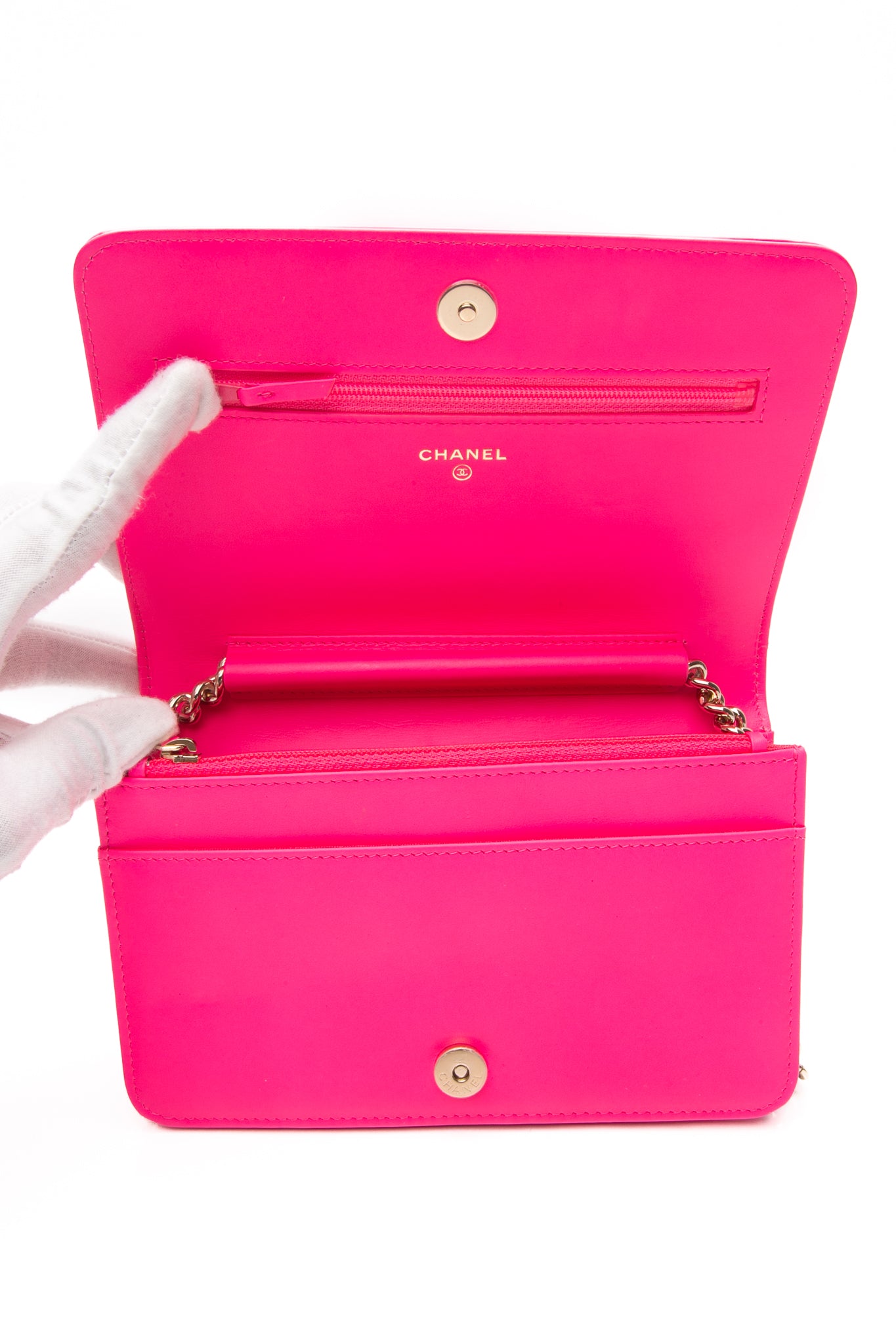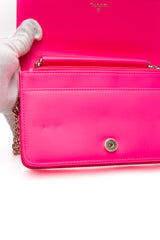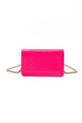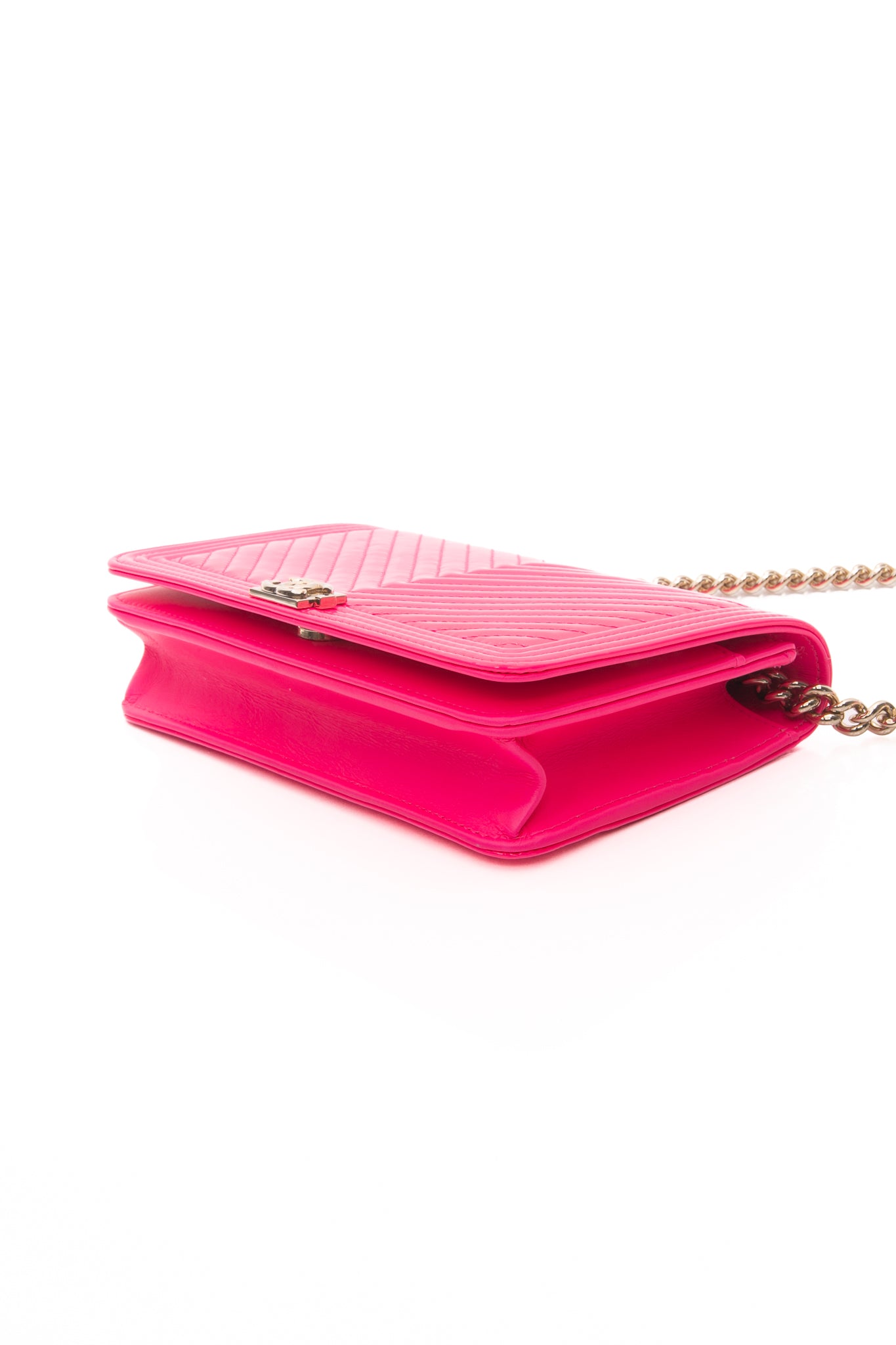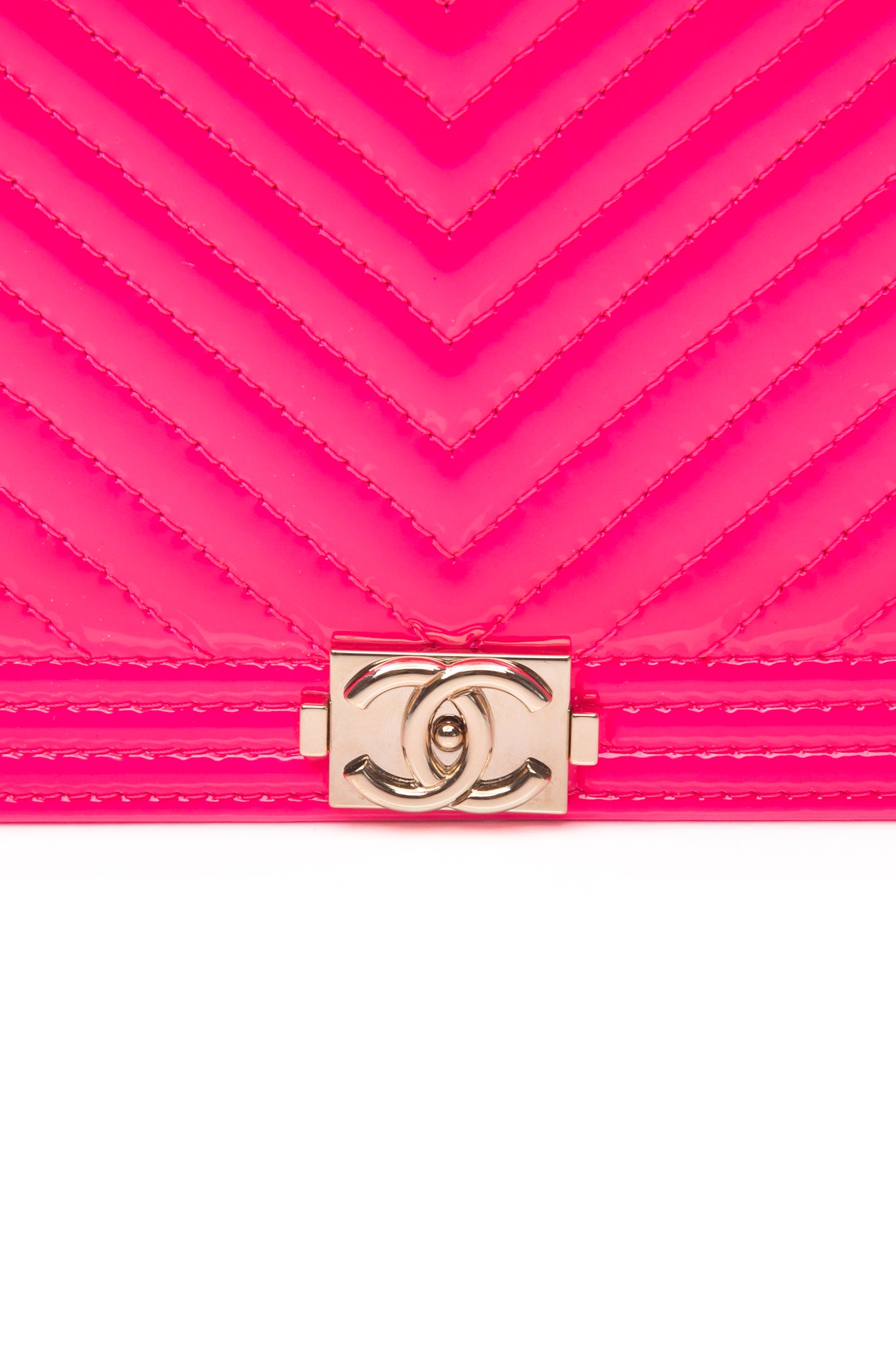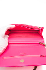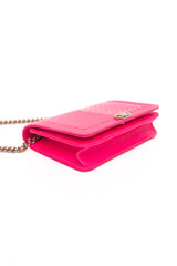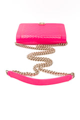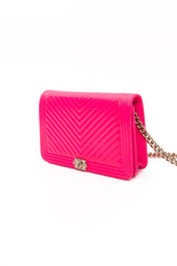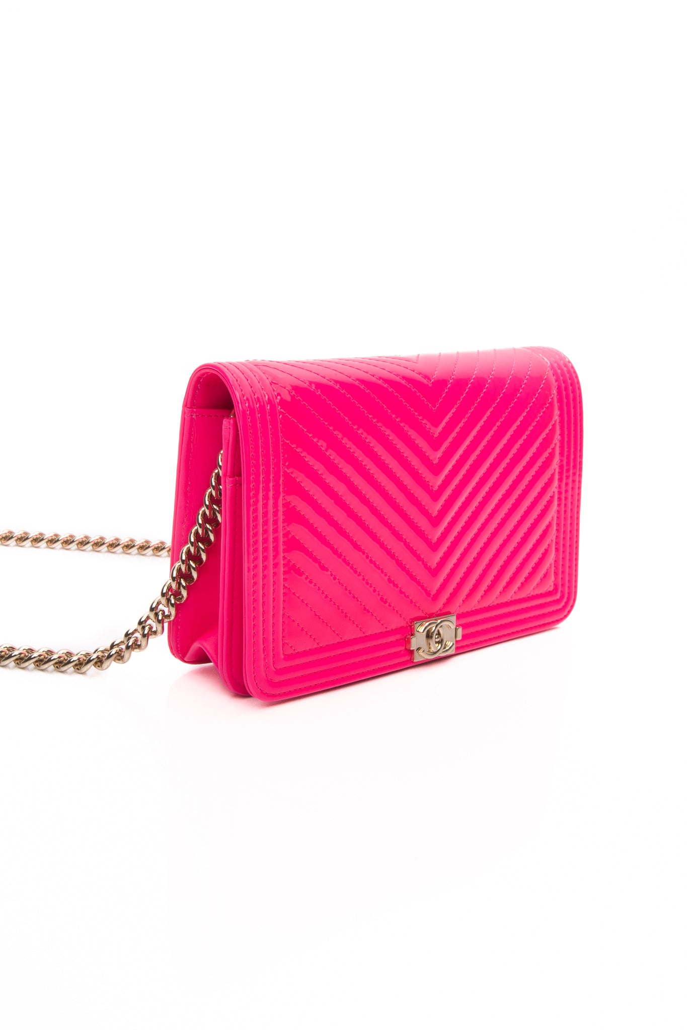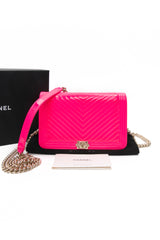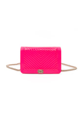 CHANEL 23C Pink Patent Leather Chevron Quilted Boy Wallet On Chain WOC
