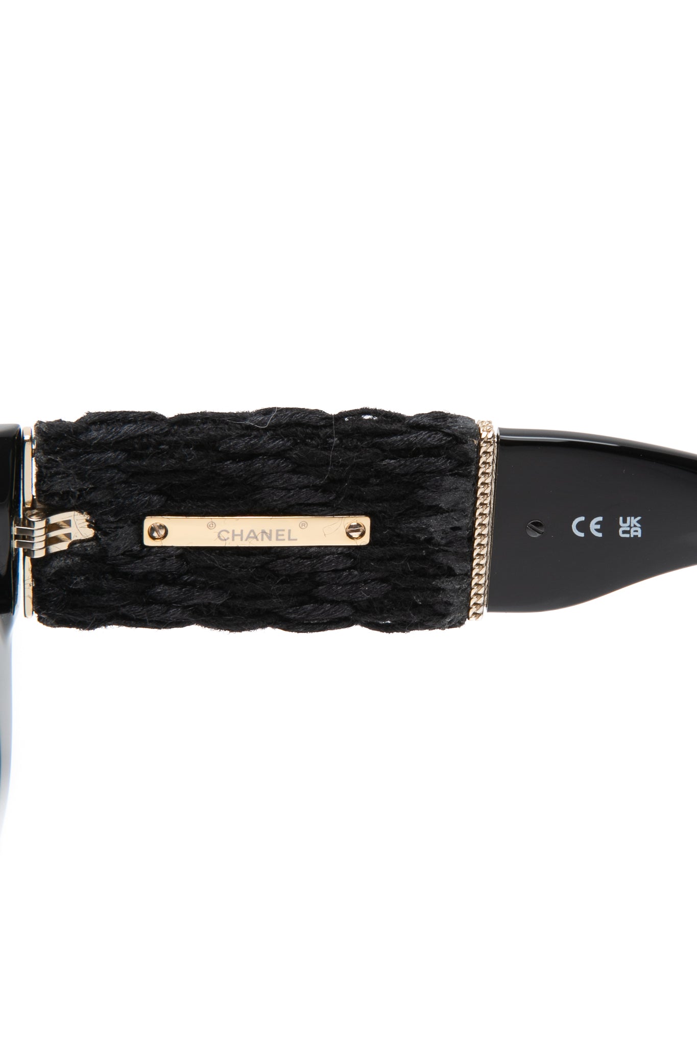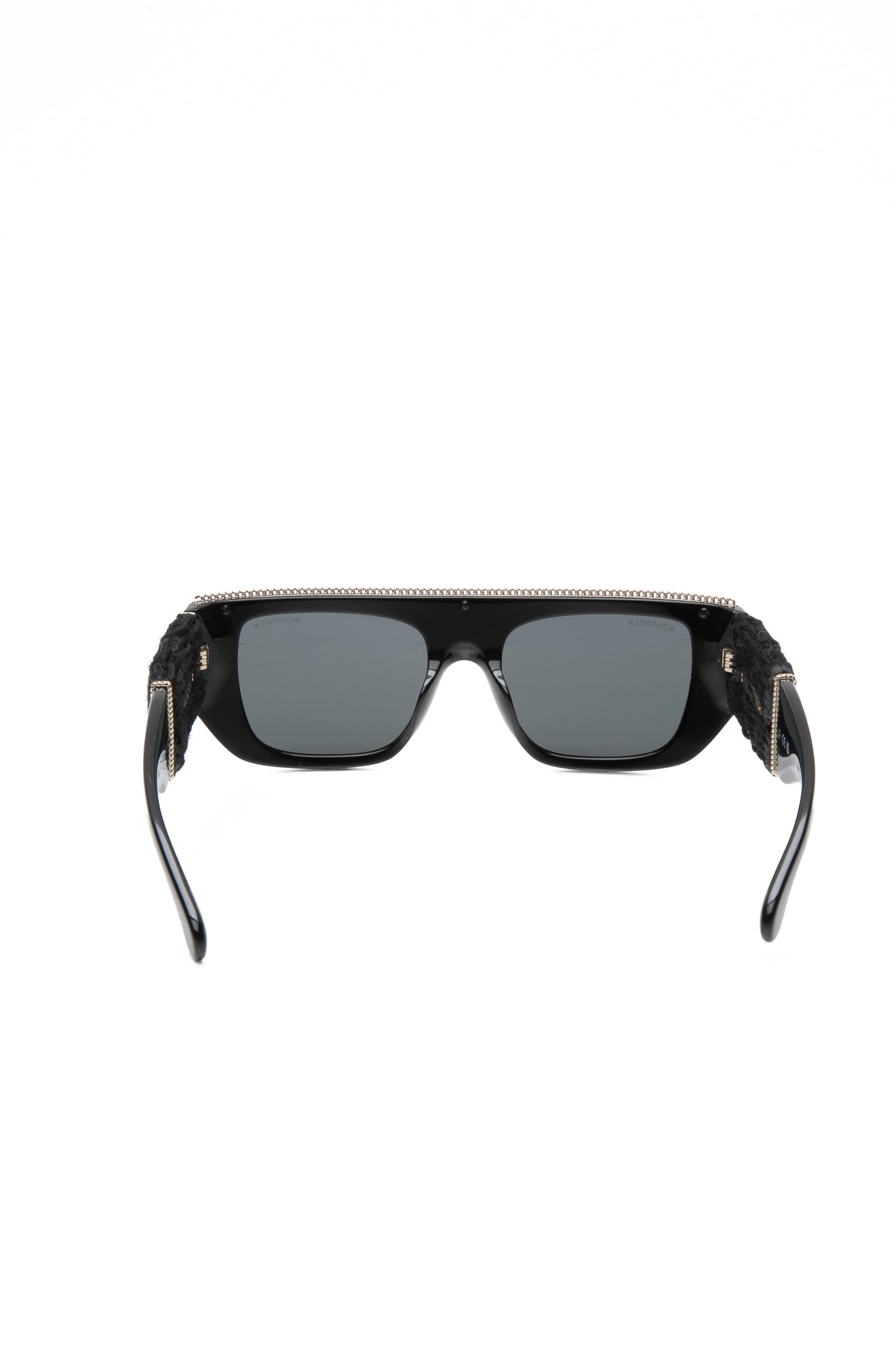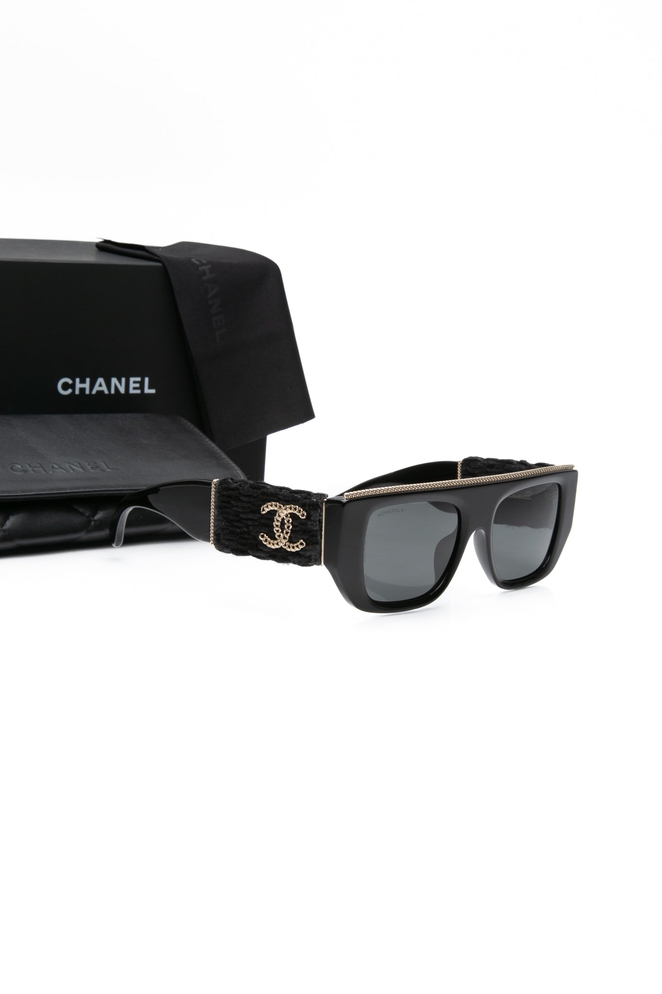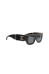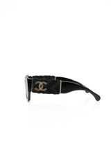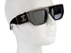 CHANEL Black Acetate Rectangular Interlocking CC Logo Tweed Pattern Sunglasses (New)