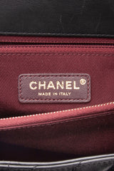This chic tote is crafted of chevron quilted calfskin leather in black. The shoulder bag features a sturdy black leather top handle, a gold chain link leather threaded shoulder strap with a shoulder pad, a rear patch pocket, and a classic CC turn lock closure. The shoulder bag opens with a flap to a partitioned burgundy fabric interior with a center zipper compartment, zipper and patch pockets.