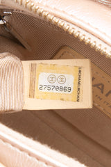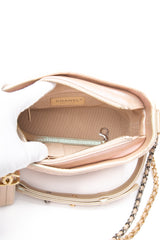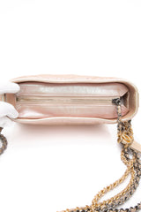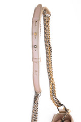 This chic shoulder bag is constructed of diamond stitched aged calfskin leather in an iridescent light pink with a smooth matching calfskin base. The cross body bag features thin ruthenium, gold, and silver chain link leather threaded shoulder straps with a leather shoulder pad. The top zipper opens to a spacious fabric interior with zipper and patch pockets.