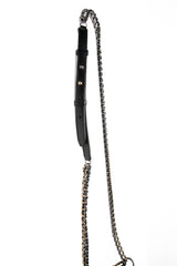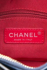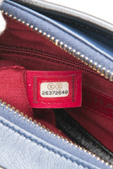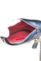 This chic shoulder bag is constructed of diamond stitched aged calfskin leather in an Navy blue and black. The cross body bag features thin ruthenium, gold, and silver chain link leather threaded shoulder straps with a leather shoulder pad. The top zipper opens to a spacious fabric interior with zipper and patch pockets.