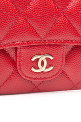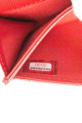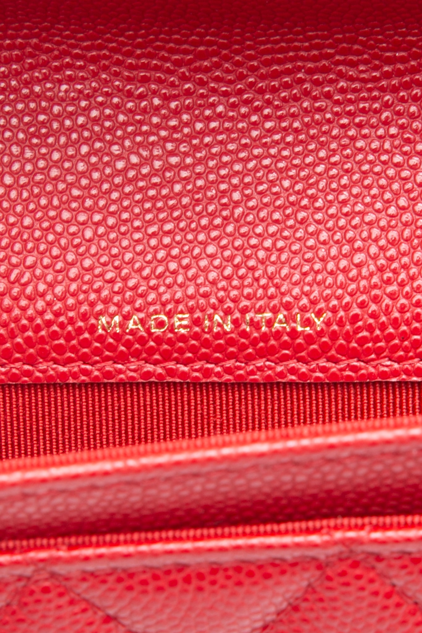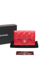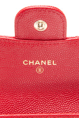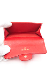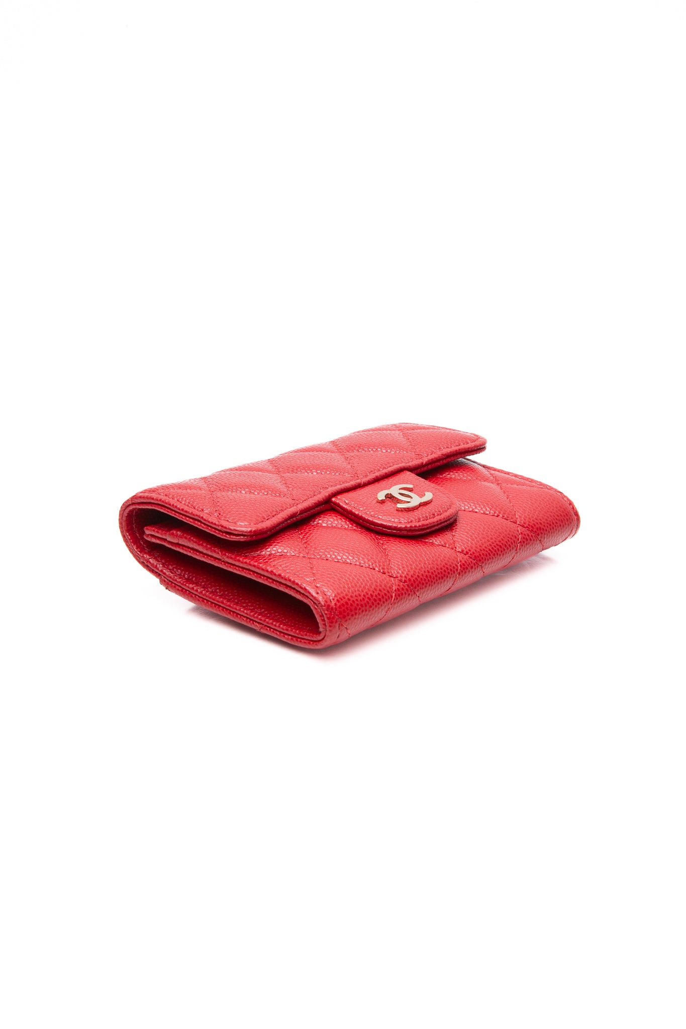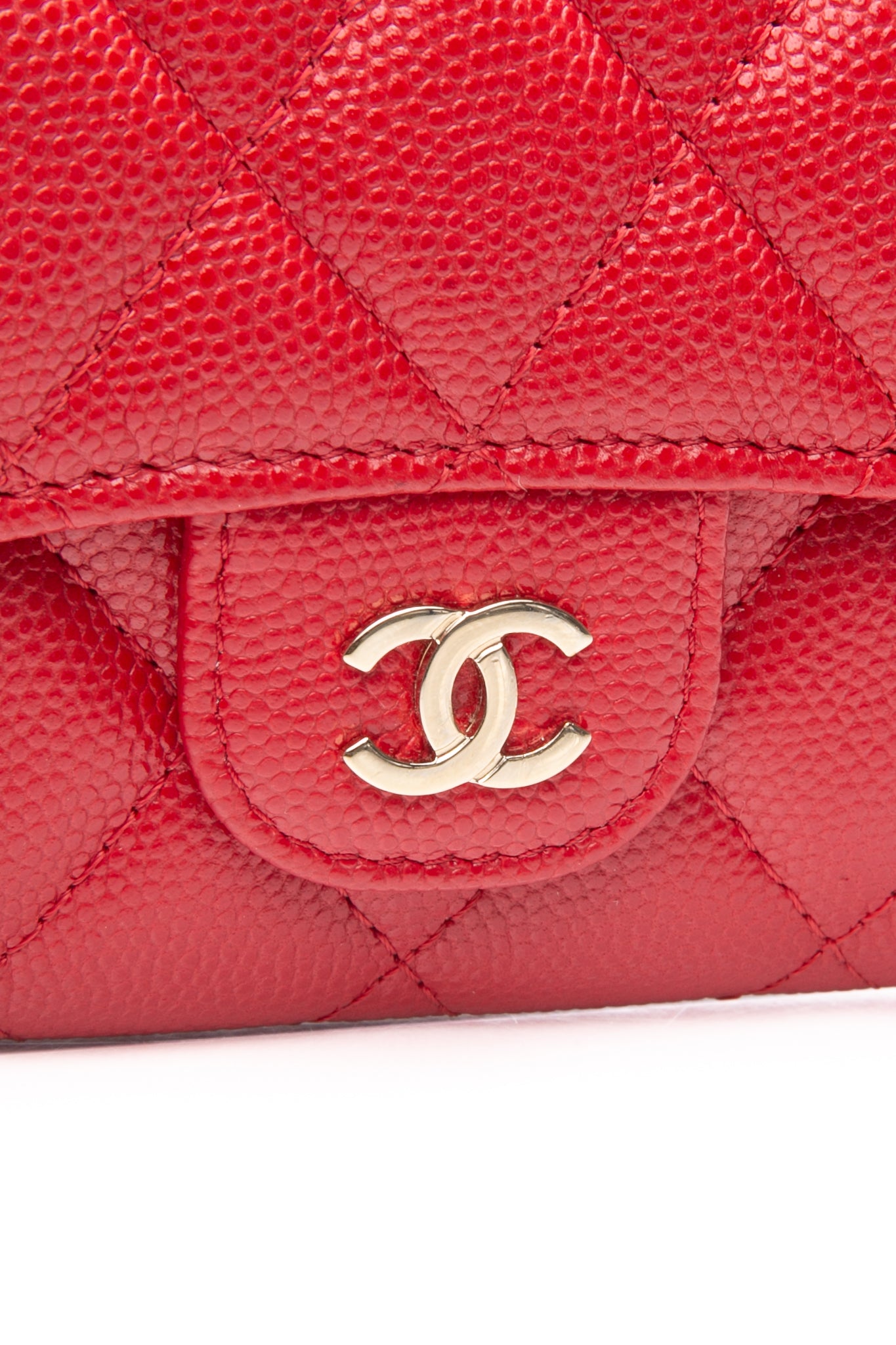 This stylish wallet is crafted of quilted caviar leather. The card holder has a small front facing polished silver CC logo that opens to a red fabric interior.