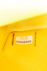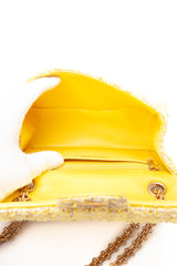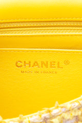This Chanel bag is crafted of tweed in yellow. It features an in The tweed handbag opens from an aged gold Mademoiselle lock to a bright yellow leather interior with a pockets.