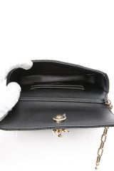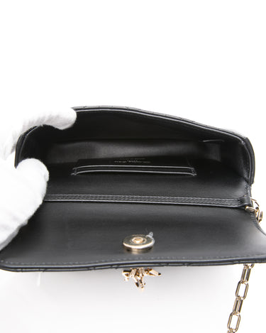 This stunning wallet on a chain is crafted of geometric quilted lambskin leather in black. The wallet on a chain features a removable chain strap, and a front flap that opens to a leather interior with card slots.
