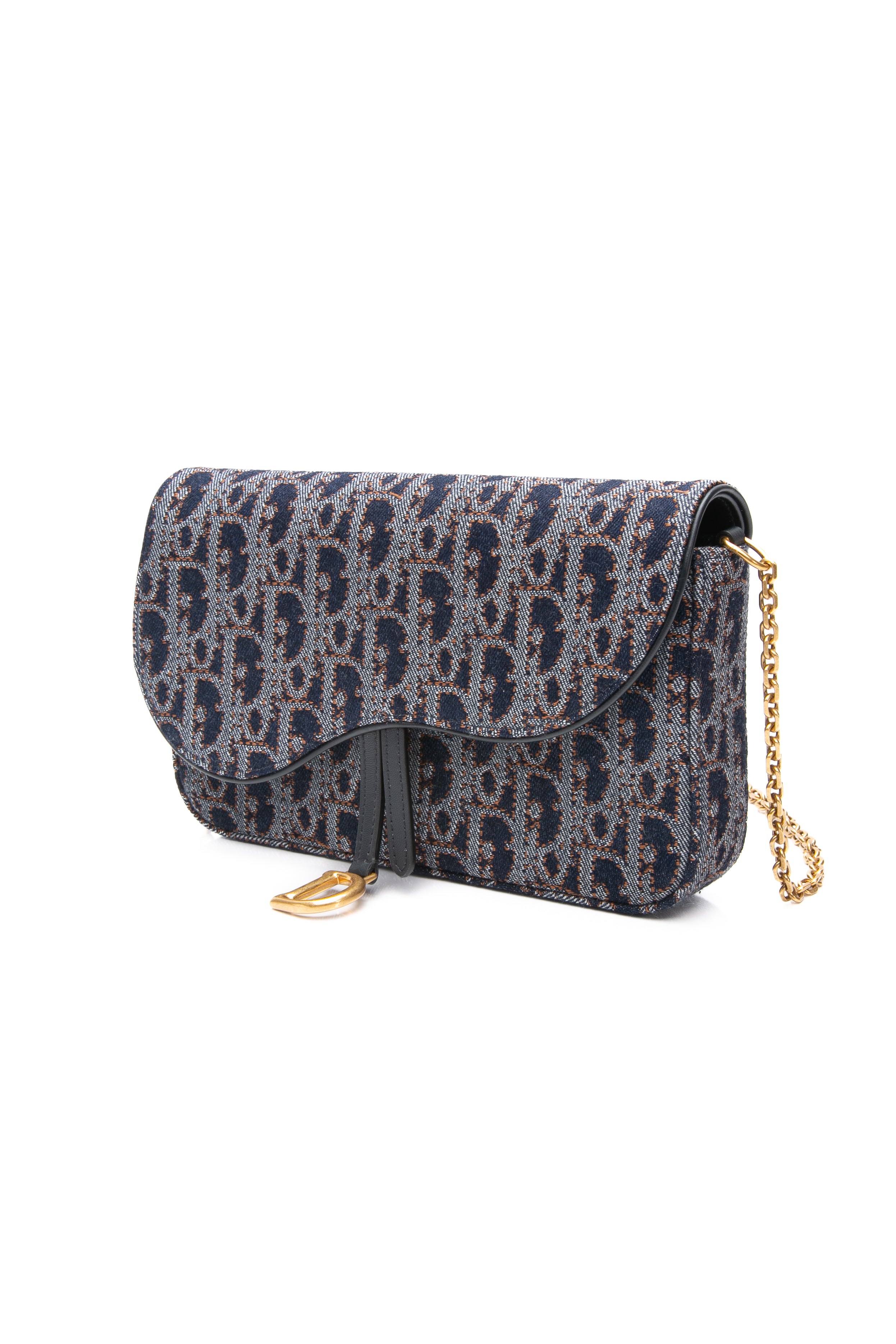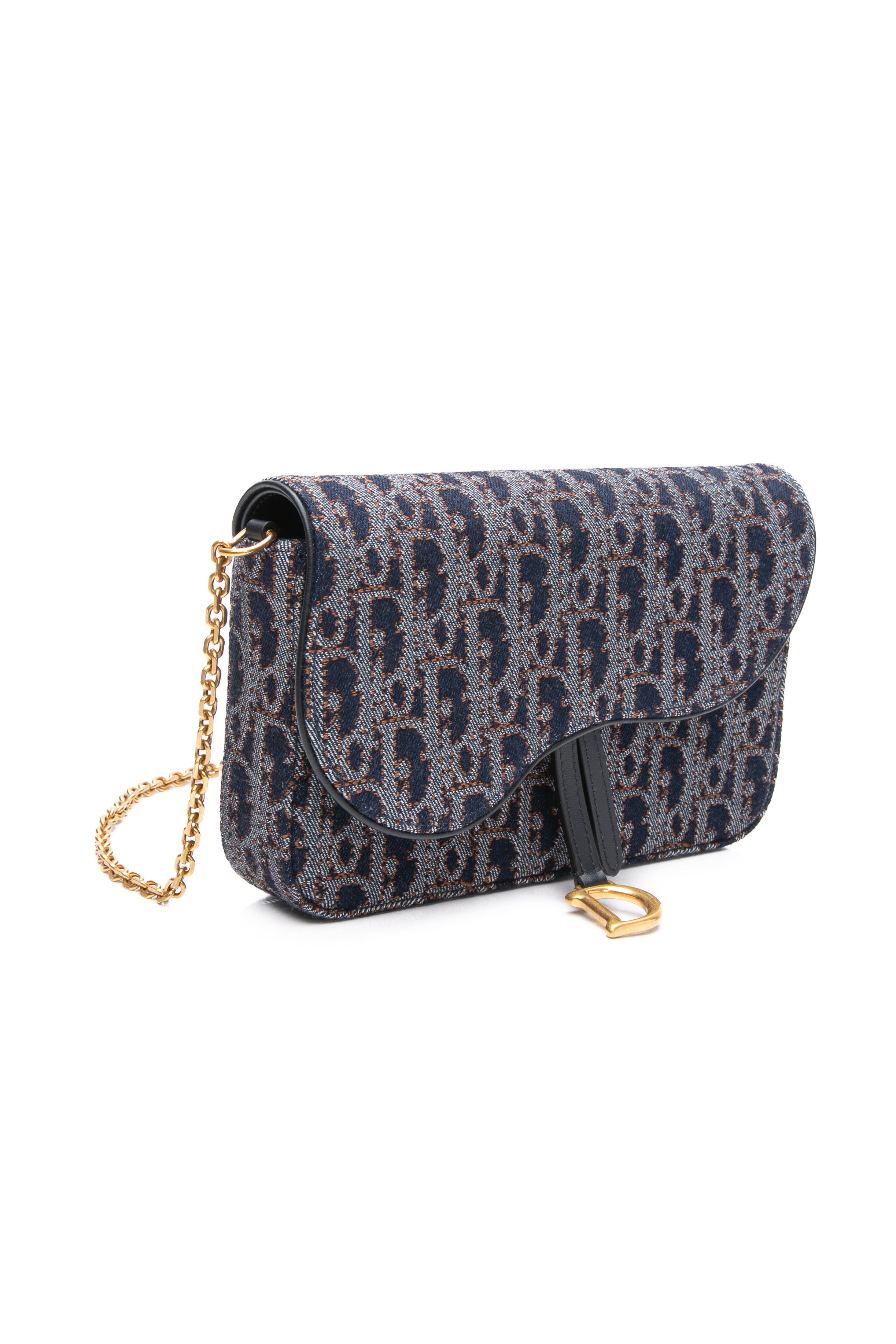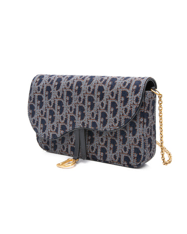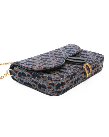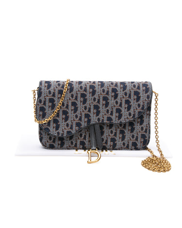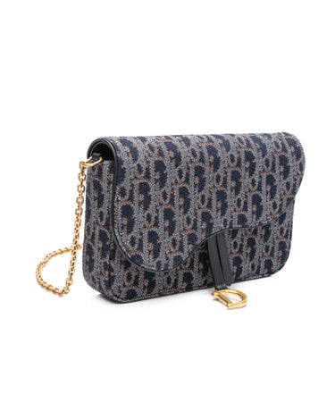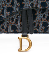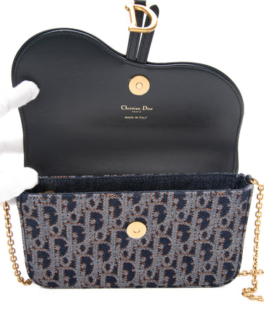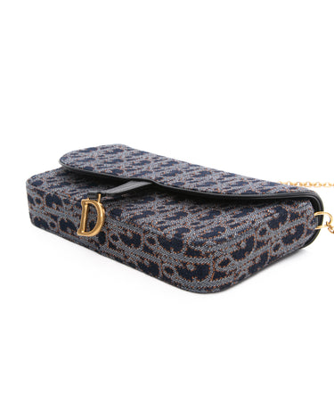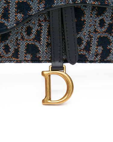 DIOR Blue and Tobacco Brown Dior Oblique Denim Medium Saddle Pouch with Chain (New)
