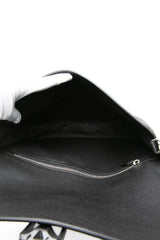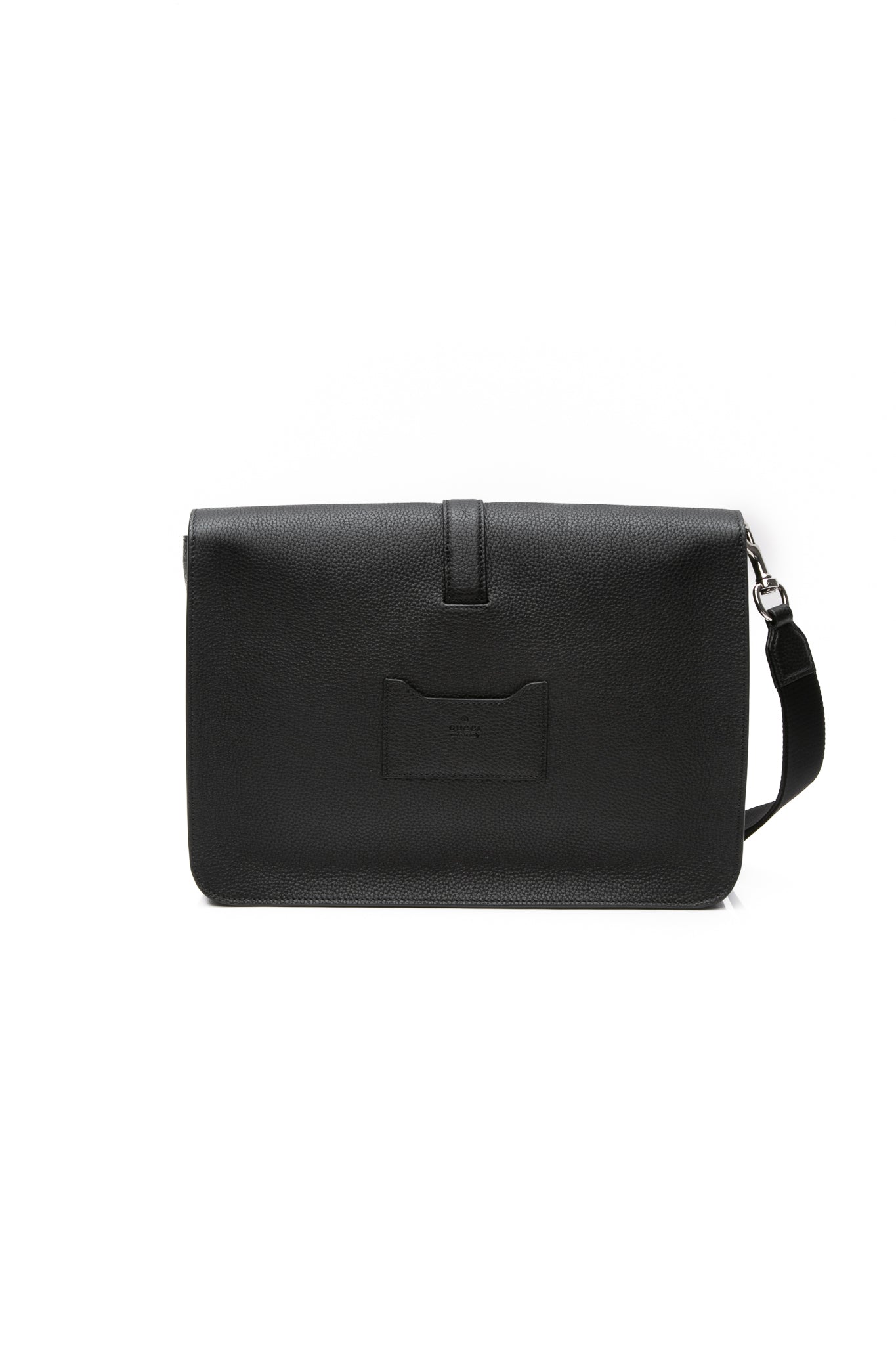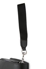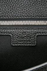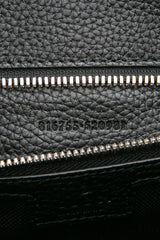 This stylish briefcase is crafted of grainy calfskin leather in black. The bag features black leather trim, an optional canvas wrist strap, and silver hardware. The front opens to a matching black fabric interior with a zipper pocket.