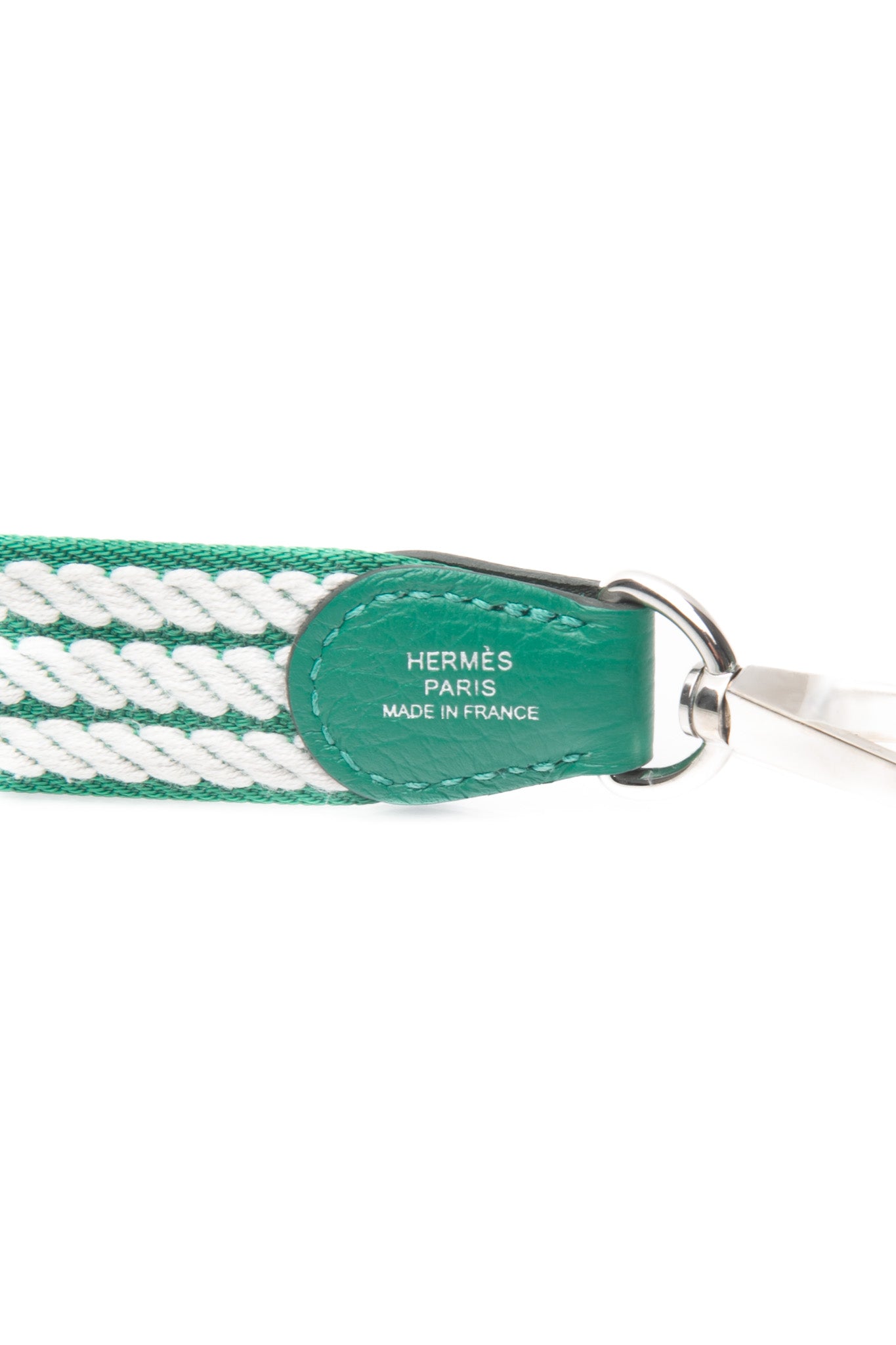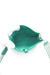 This petite crossbody bag has a classic messenger shape and is crafted of pebbled clemence leather in vert vertigo green color, with a perforated Hermes H oval logo on the front. The bag features canvas crossbody strap with palladium tone hardware. The top opens with a small cross over strap and snap to a matching suede interior.