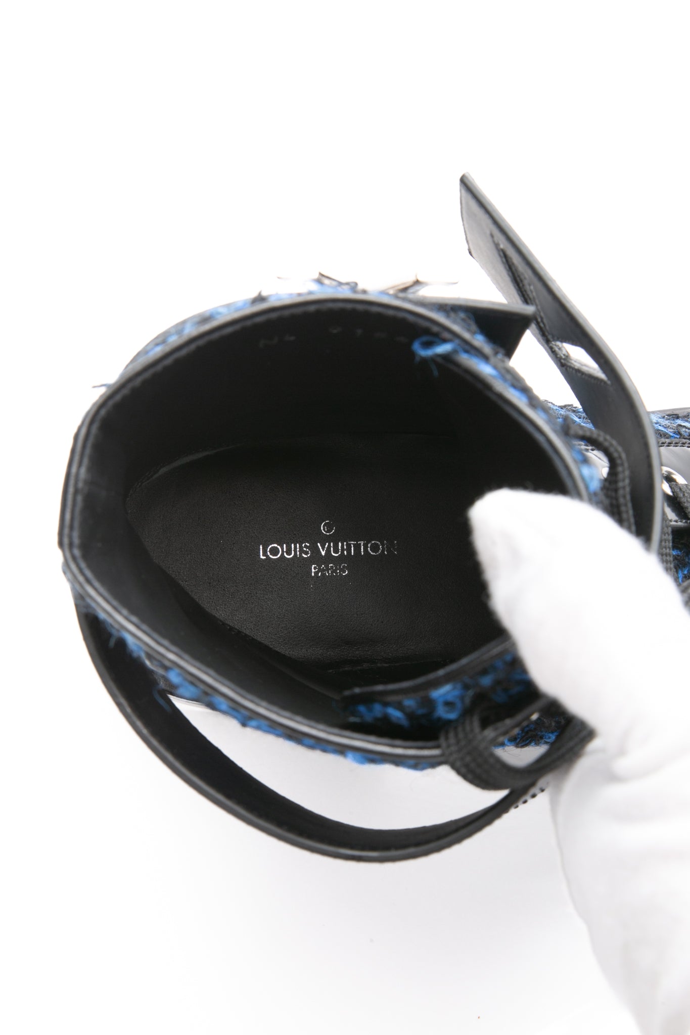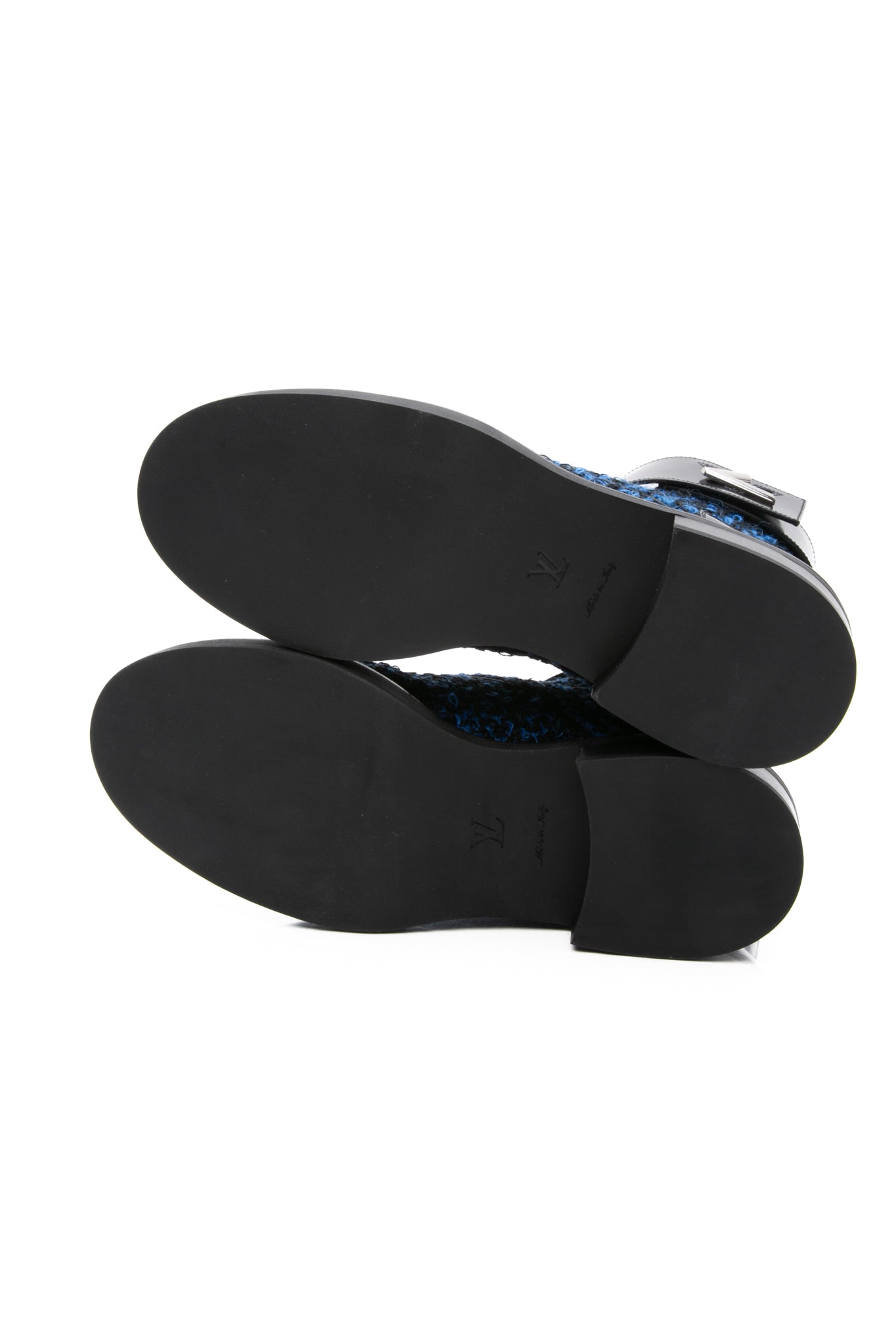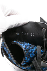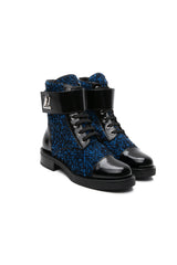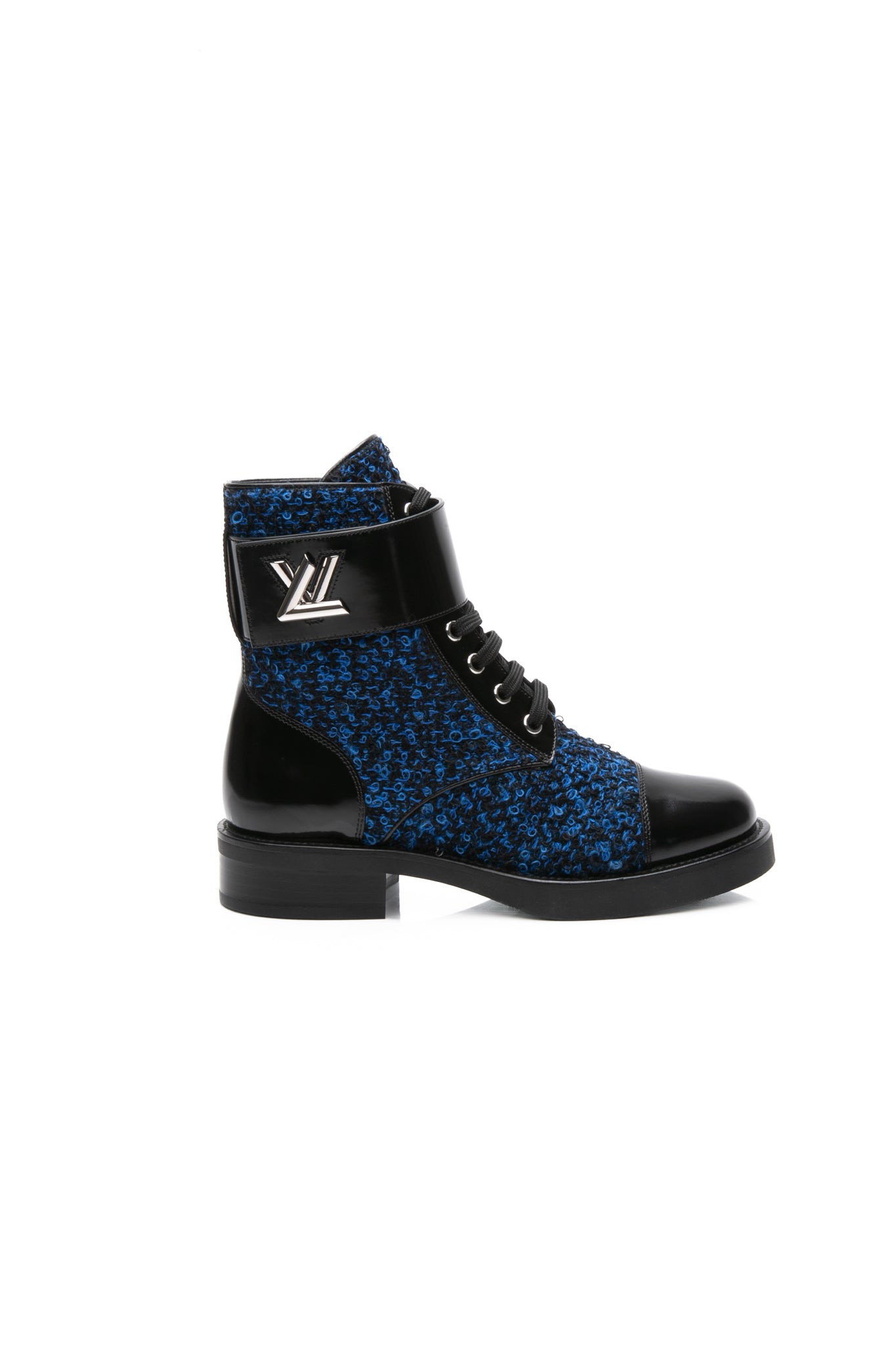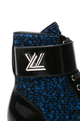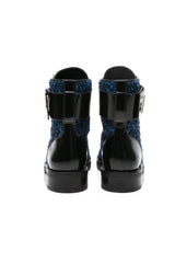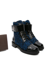 LOUIS VUITTON Black and Blue Tweed Signature LV Twist Clasp Wonderland Flat Ranger Combat Boots 37