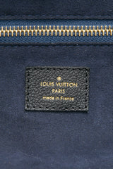 This stylish tote is crafted of Louis Vuitton's signature monogram empreinte canvas in black. This shoulder bag features a black leather trim including strap handles and side cinch-cords with polished brass hardware. The bag opens to a navy blue interior.