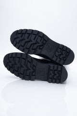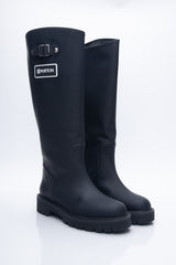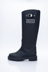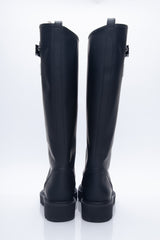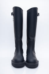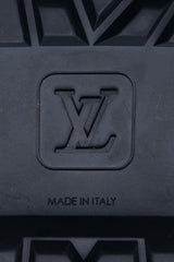 Rubber-effect calf leather gives the Territory flat high boot the appearance of an authentic rain boot. The rubber outsole is color-matched to the upper for an original "dipped-in-paint" look. This slip-on model is signed with a Vuitton tag and an engraved, silver-tone buckle and studs.