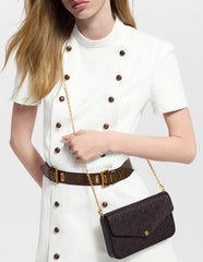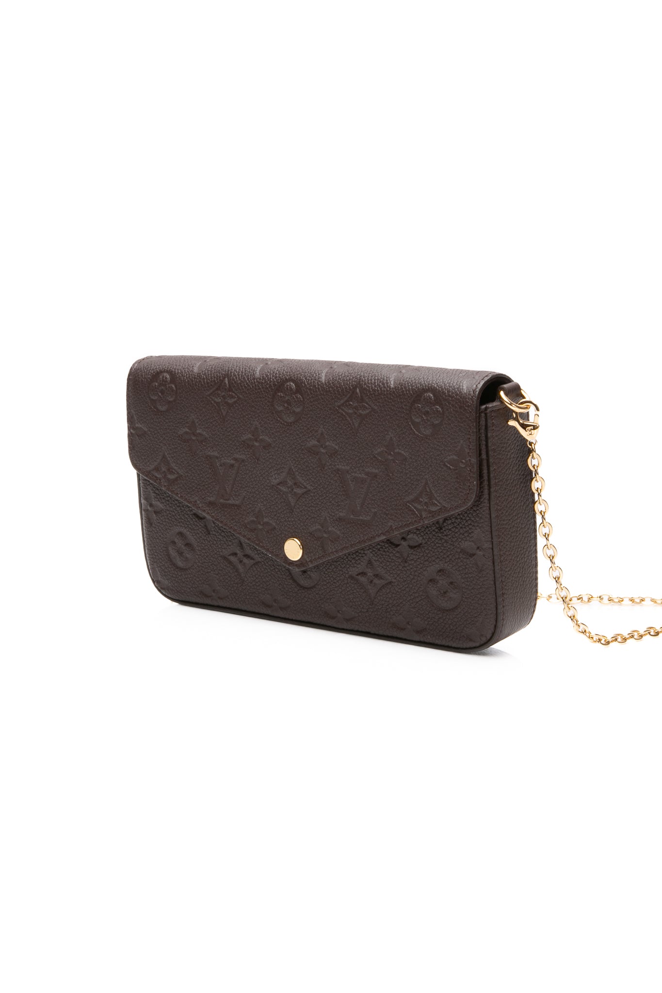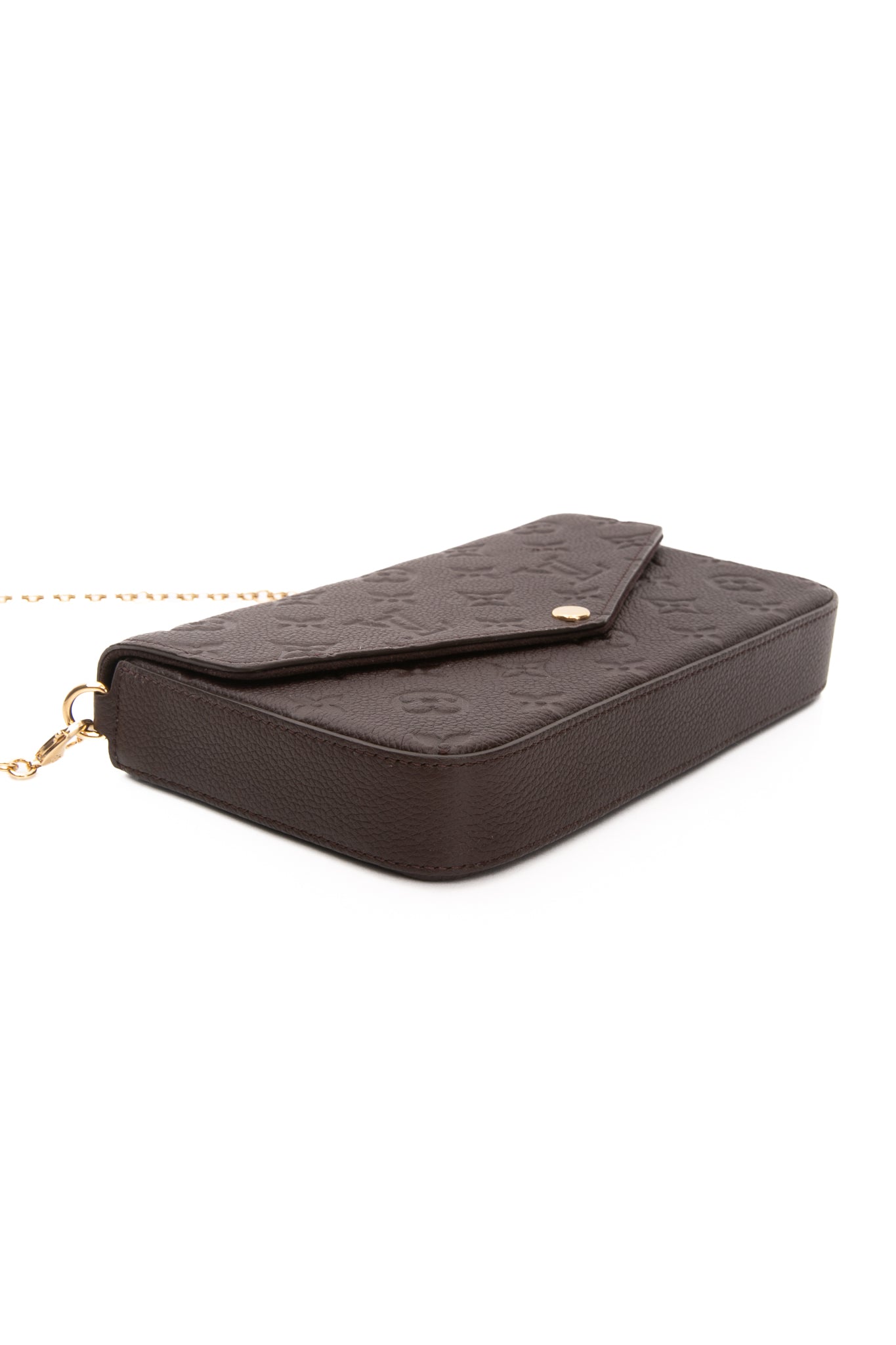 The Pochette Félicie is crafted from Monogram Empreinte leather, embossed with Louis Vuitton's signature Monogram pattern. Designed to adapt to modern lifestyles, this envelope-style pouch contains a spacious compartment. It can also be carried in different ways thanks to a removable gold-tone chain.