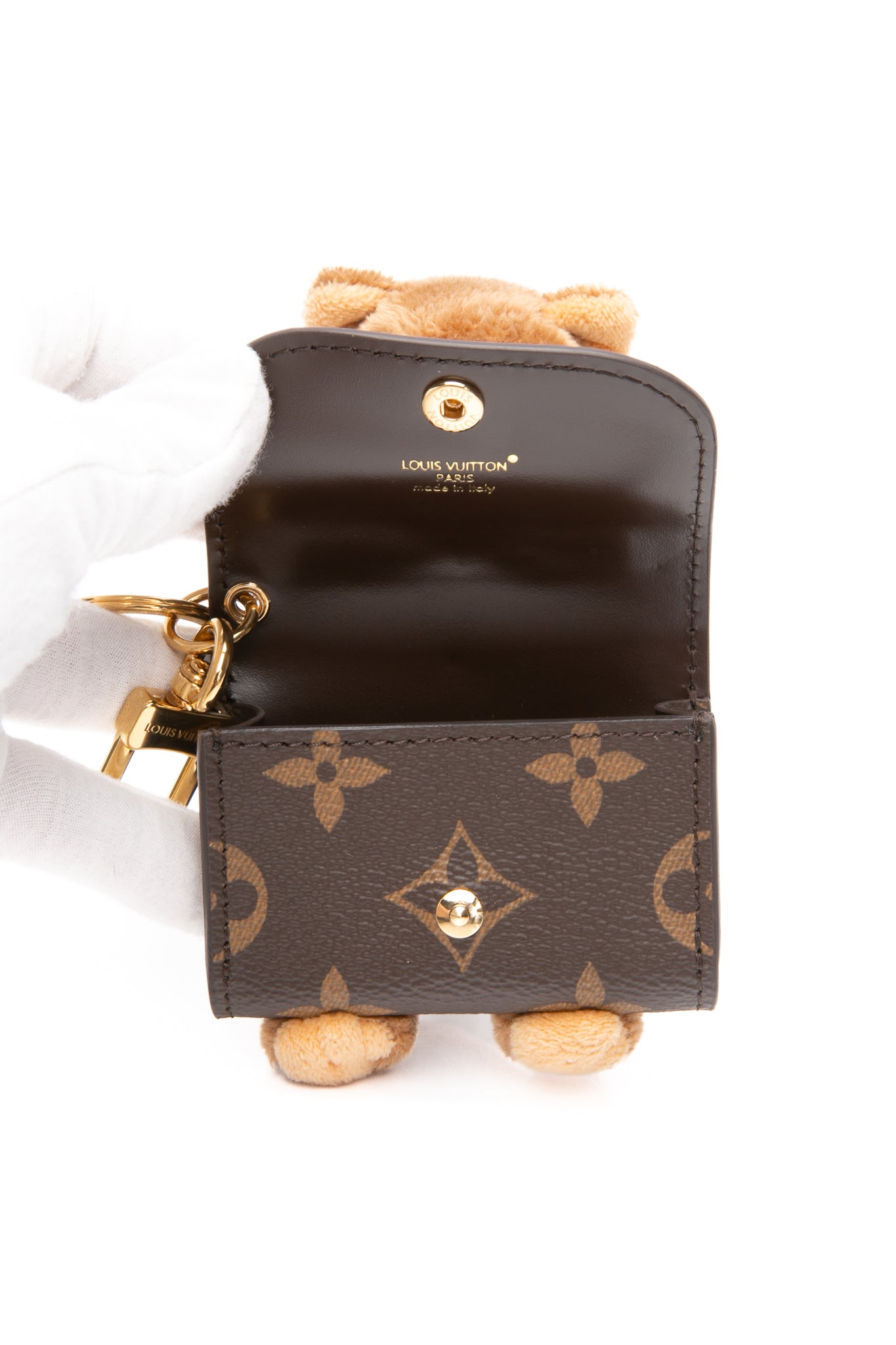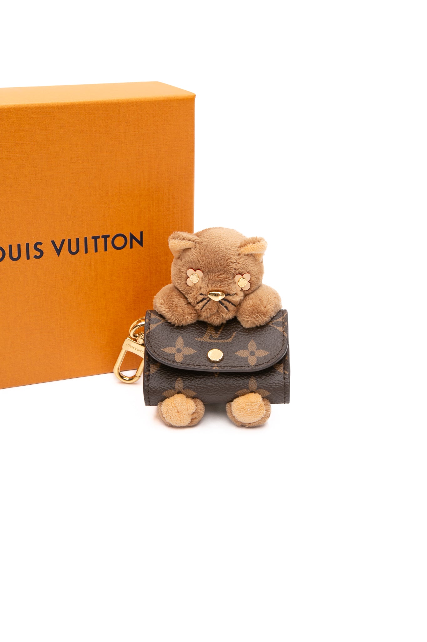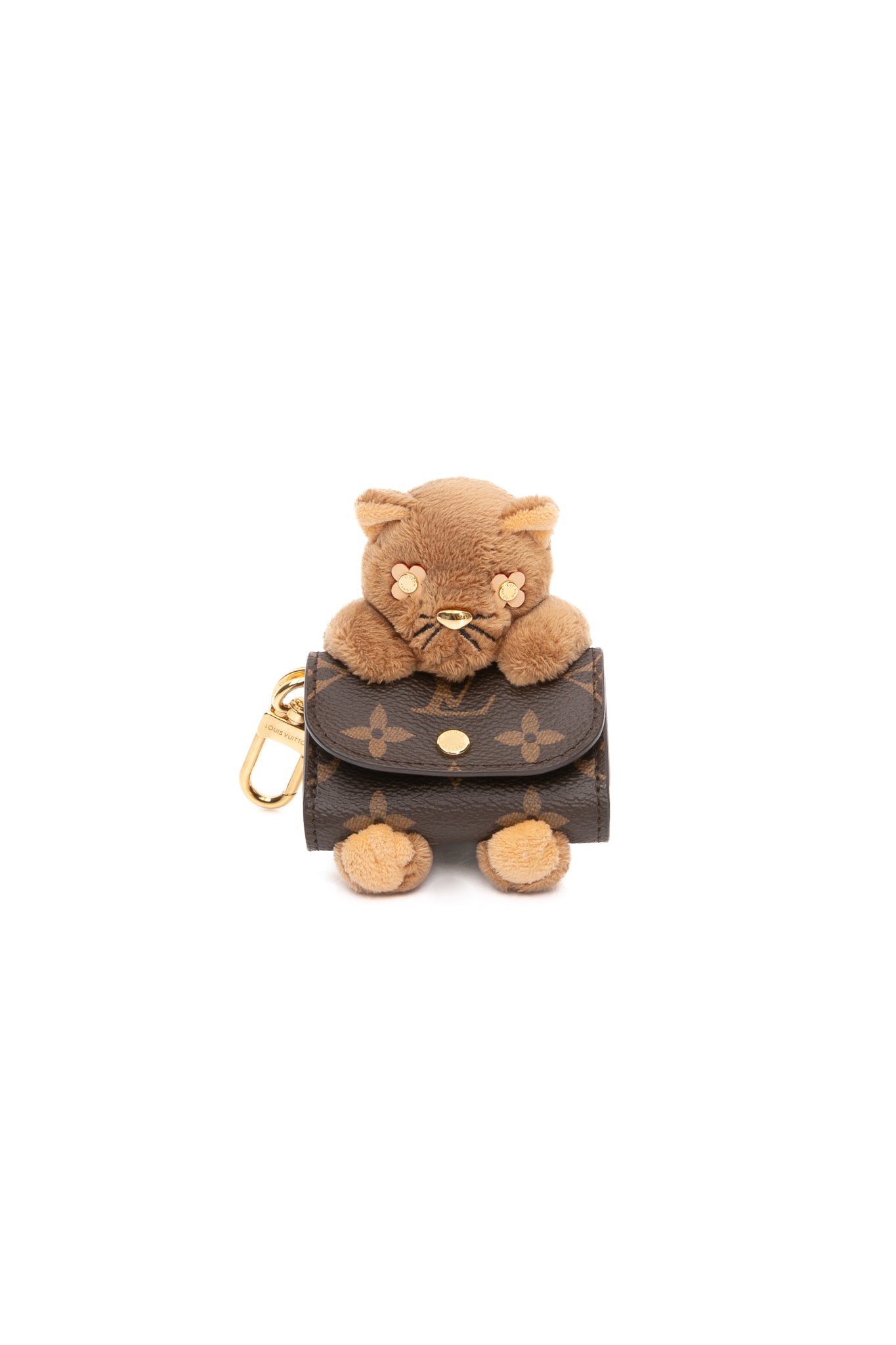 The new LV Cute Cat Pouch earphone case exemplifies Louis Vuitton’s flair for combining utility with aesthetic appeal. A handy Monogram canvas pouch is attached to an adorable plush cat with Monogram Flower eyes. Easy to snap onto a belt loop or handbag, it’s a fun way to keep small personal items close at hand.