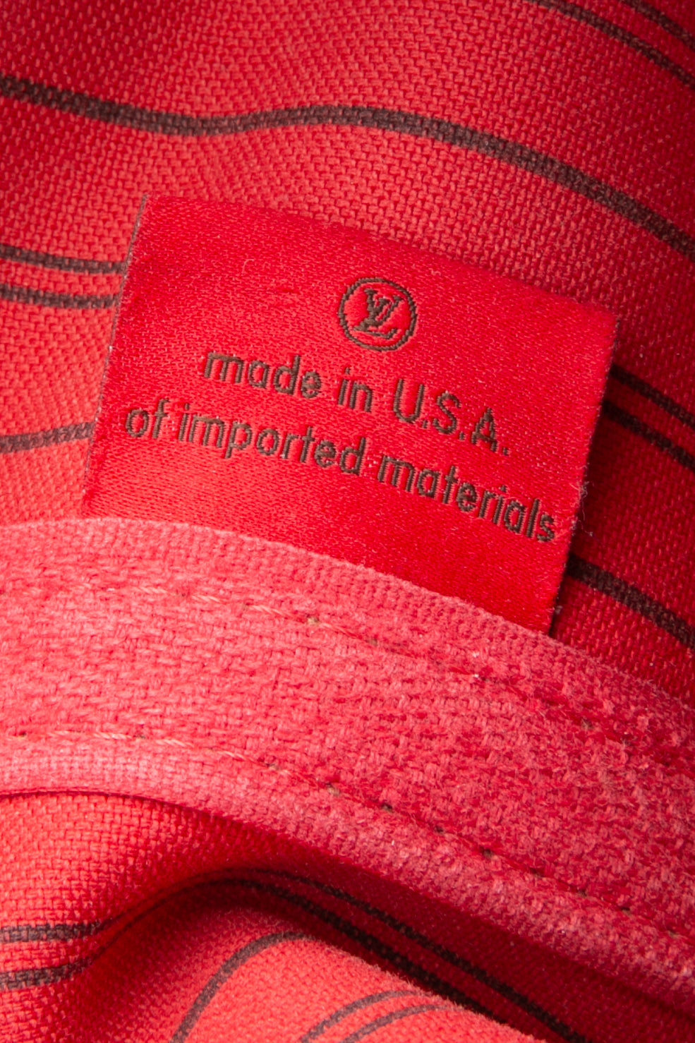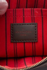 This chic handbag is crafted of classic Louis Vuitton Damier checkered canvas with dark brown cowhide leather top shoulder straps and trim. The top is open to an interior of red striped fabric with a hanging zipper pocket and a removable pouch.