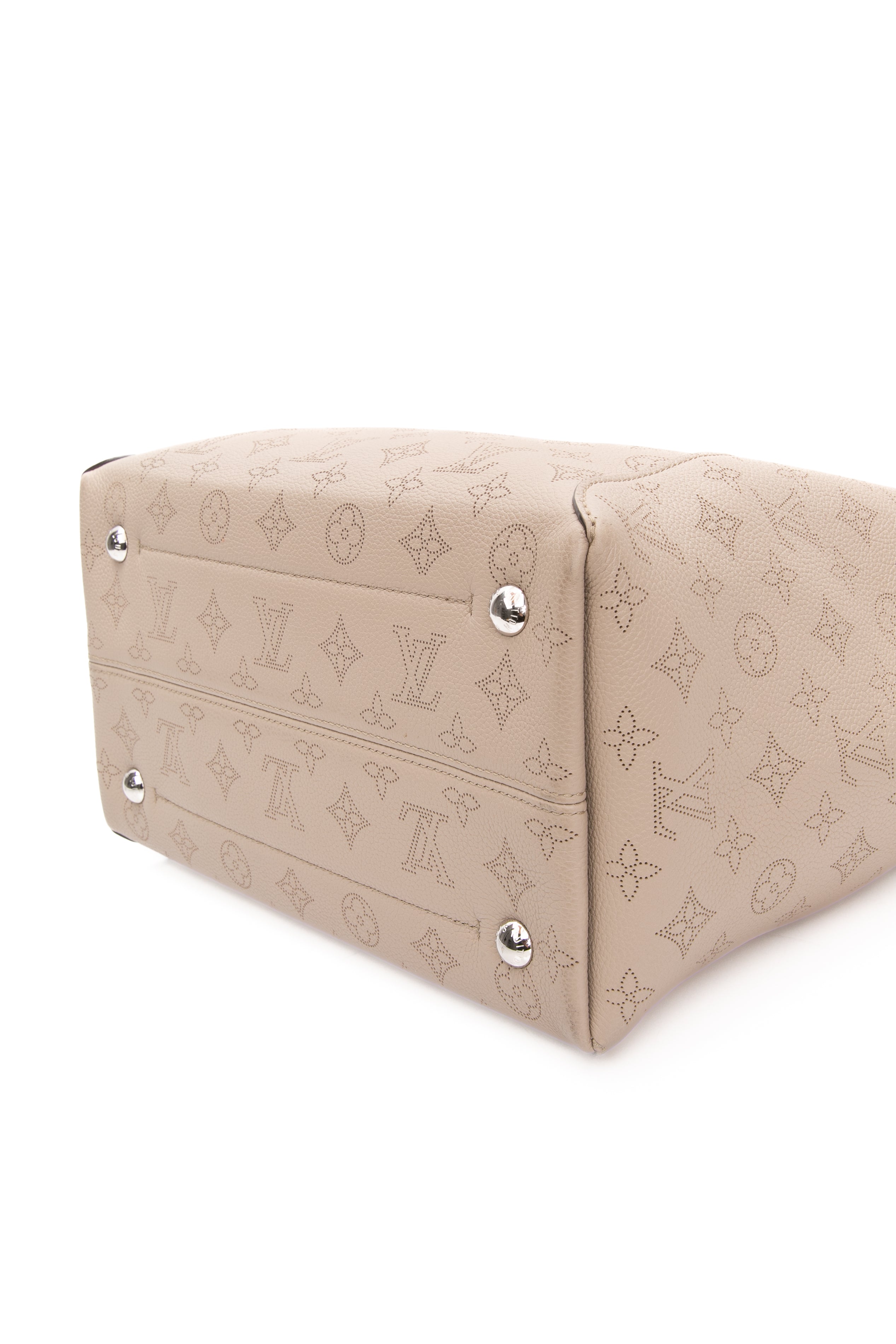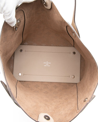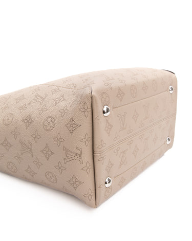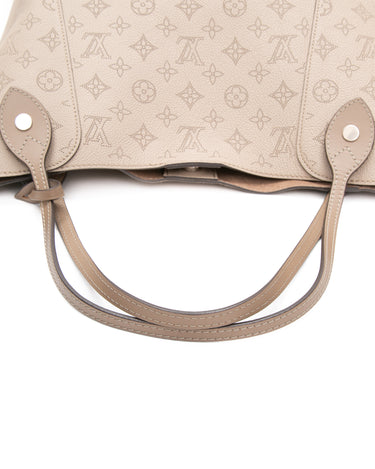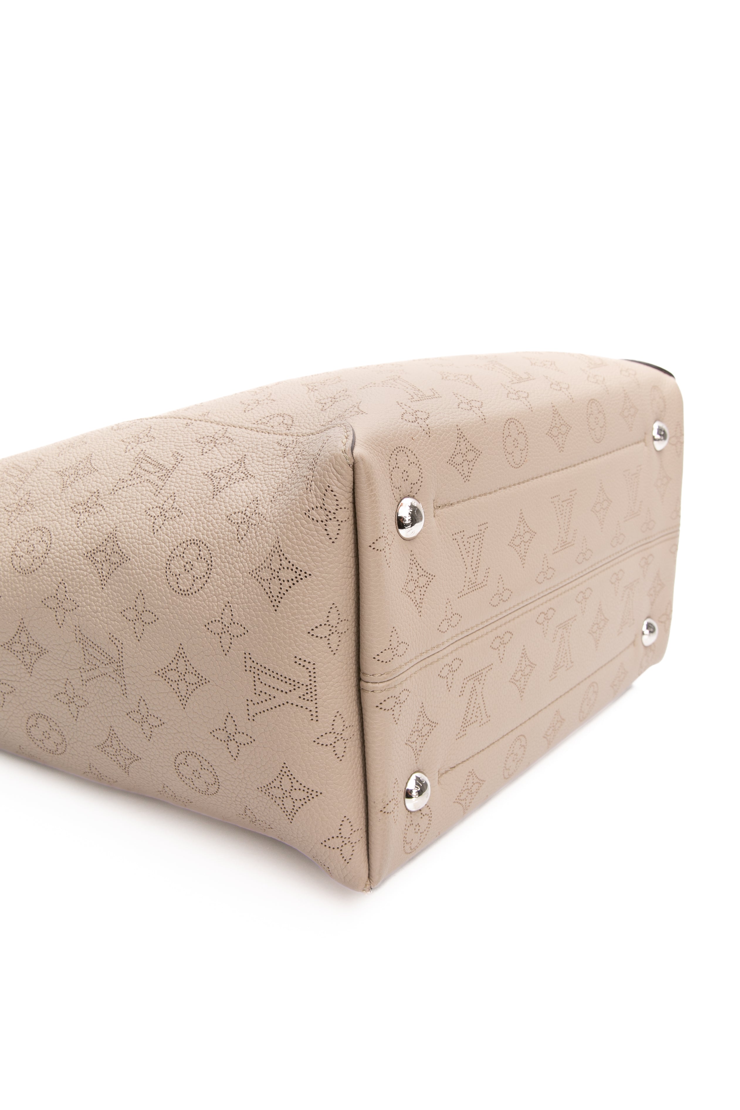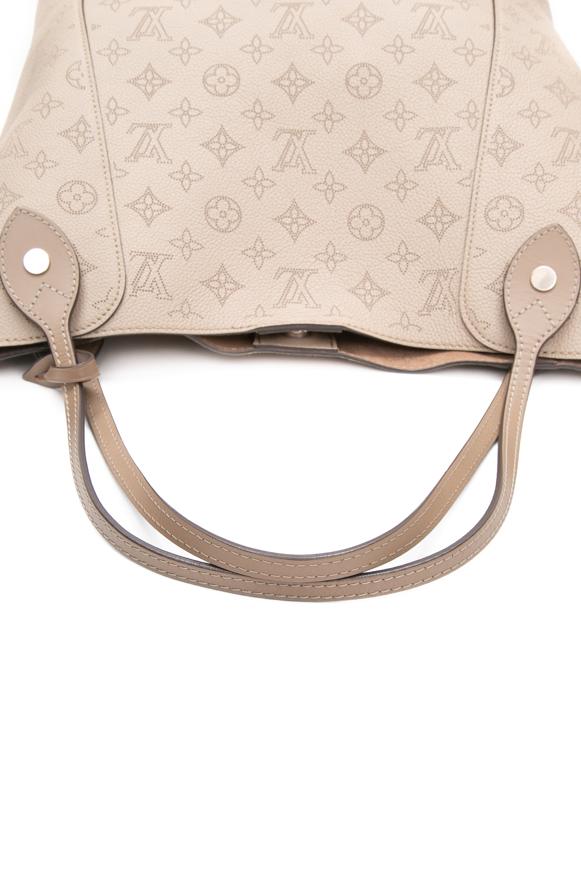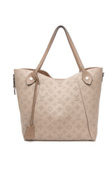 This stylish tote is crafted of taupe calfskin perforated with the Louis Vuitton monogram. The bag features leather top handles and polished silver hardware. The top is open to a matching brown perforated suede interior with a matching pochette.