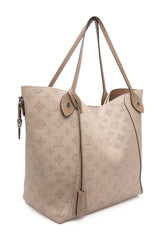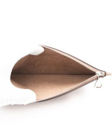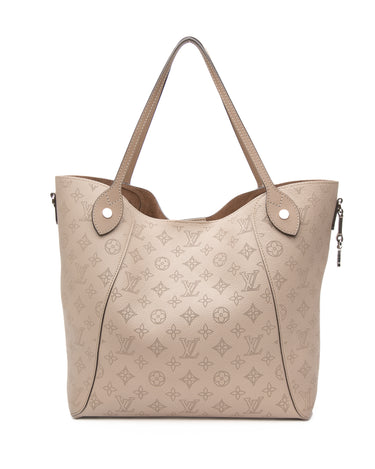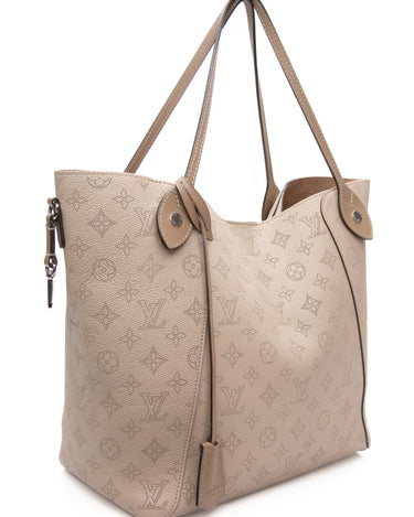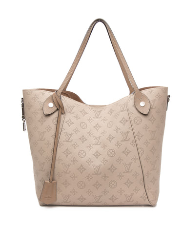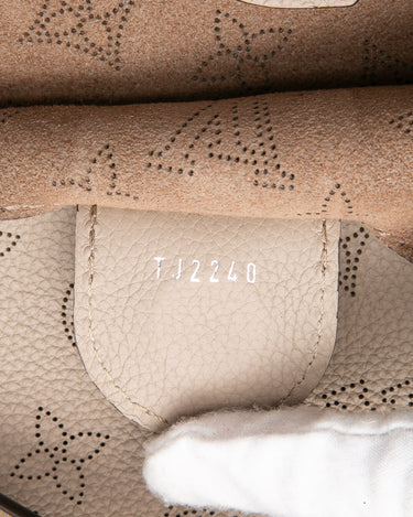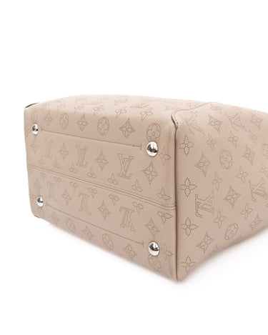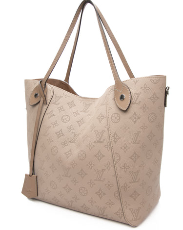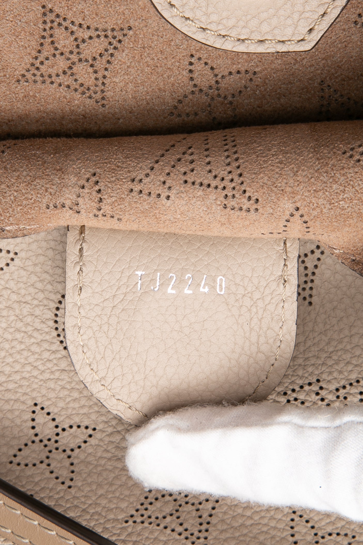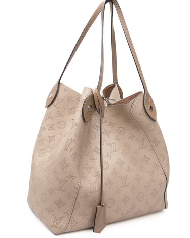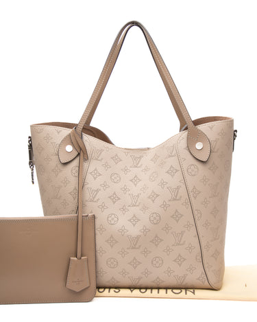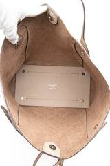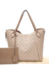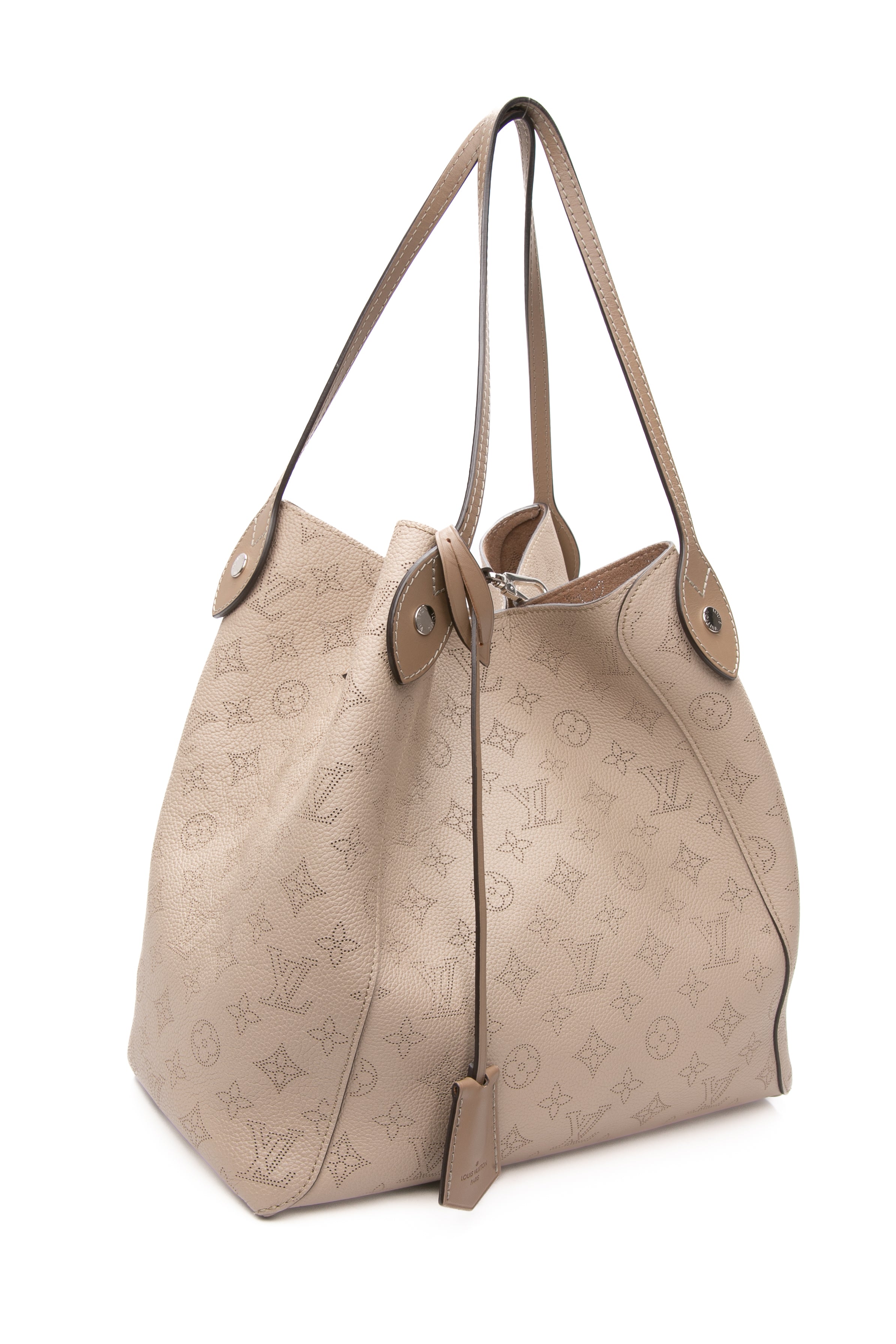 This stylish tote is crafted of taupe calfskin perforated with the Louis Vuitton monogram. The bag features leather top handles and polished silver hardware. The top is open to a matching brown perforated suede interior with a matching pochette.