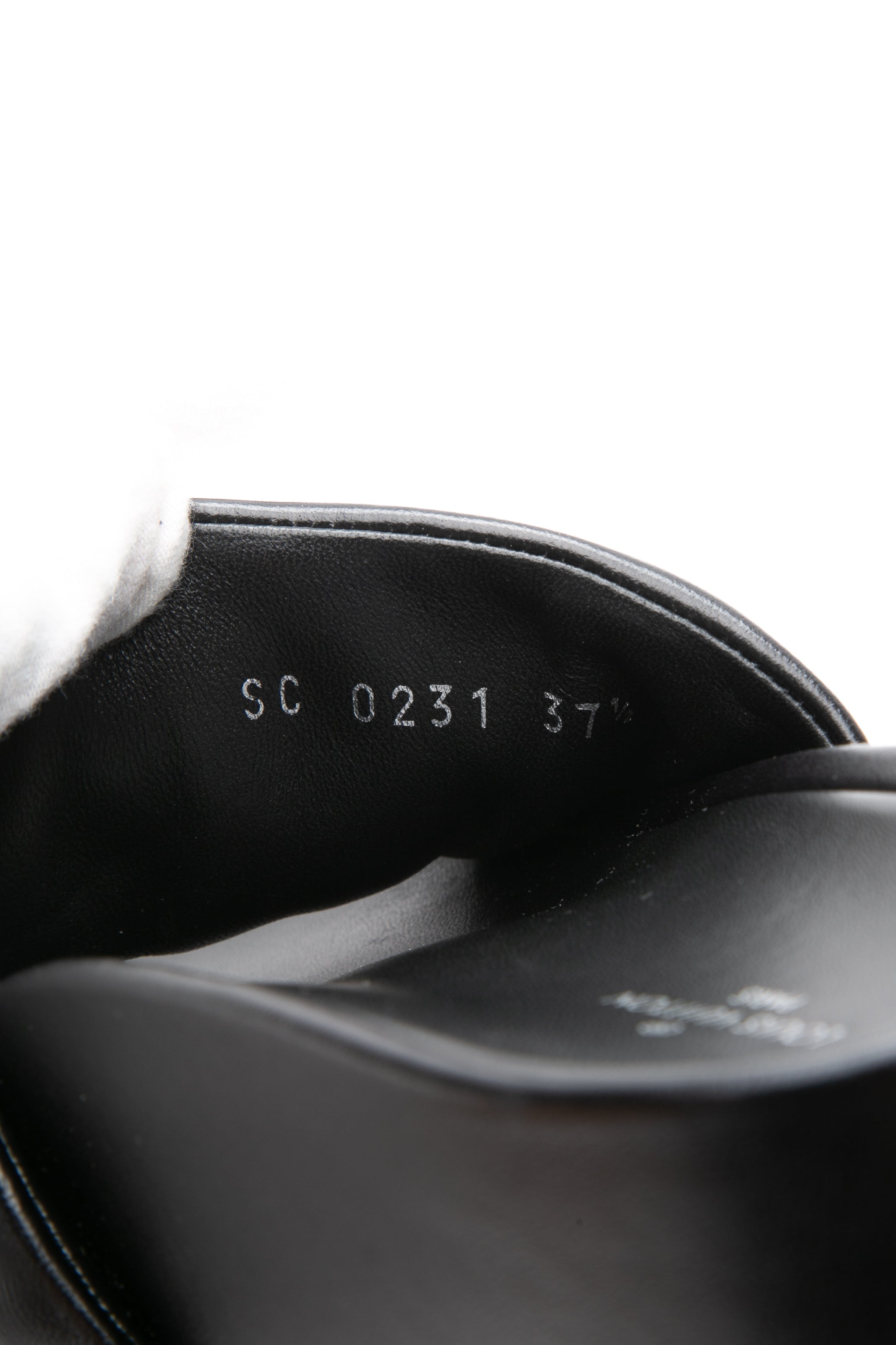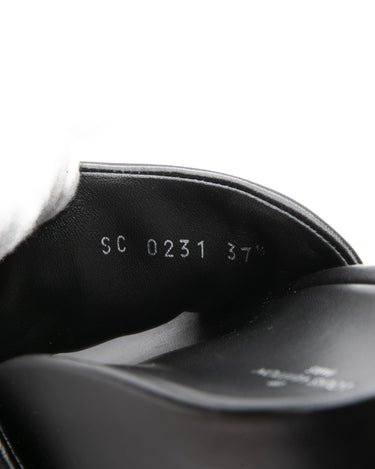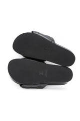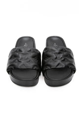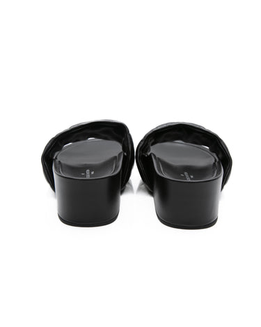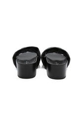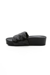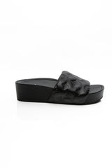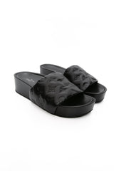 These chic slides are crafted of embossed lambskin leather in black. They feature a platform that runs from 1 to 2 inches from toe to heel.