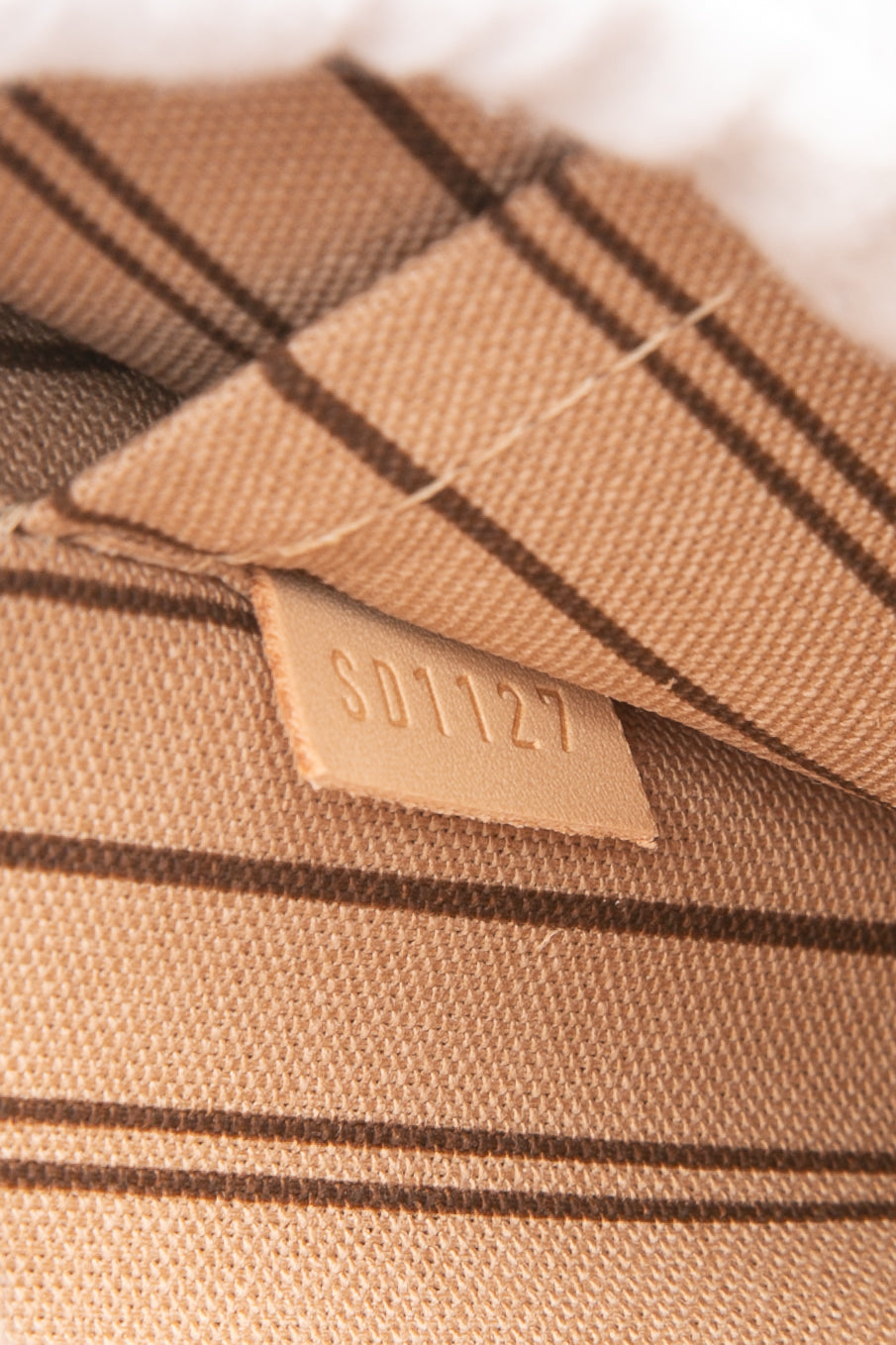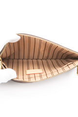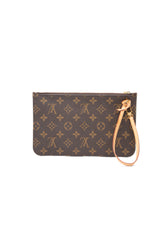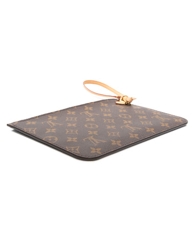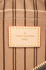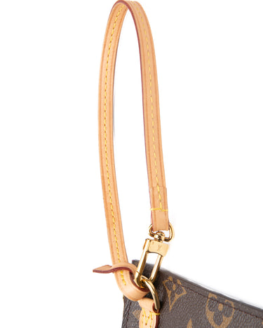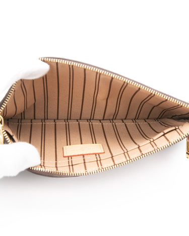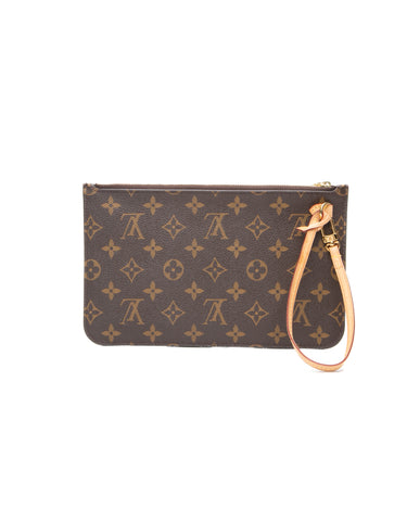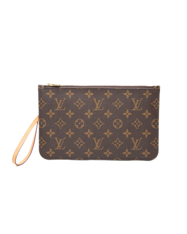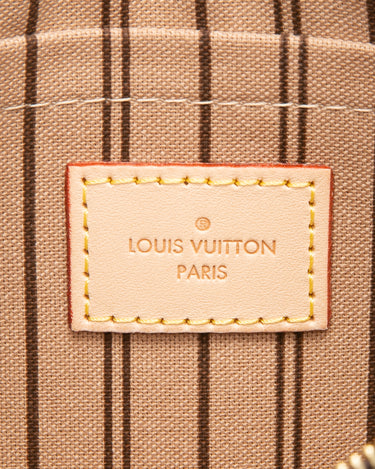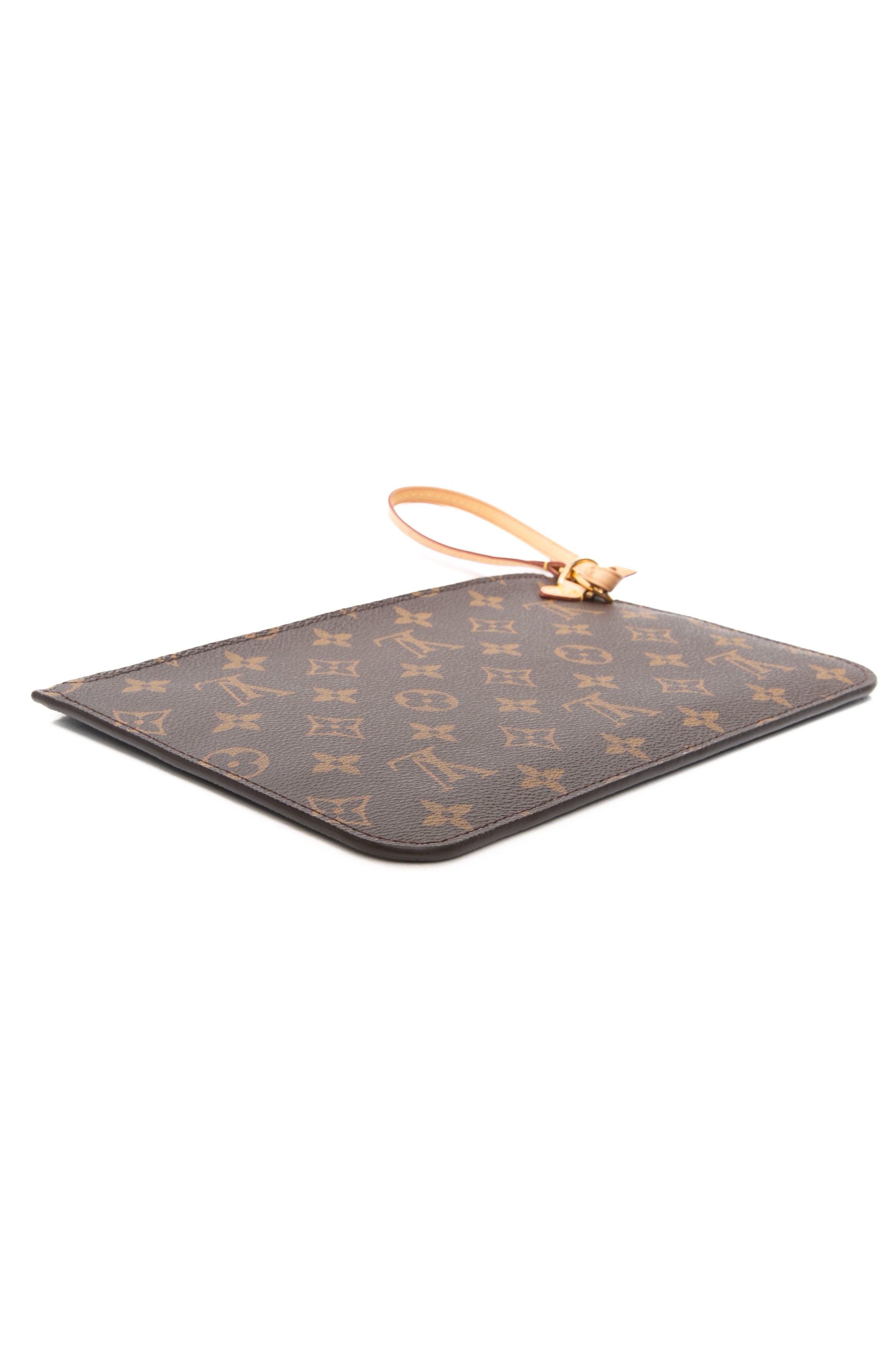 This pochette is crafted of signature Louis Vuitton monogram canvas. This pochette features a polished gold top zipper and opens to a beige striped fabric interior with a flat pocket.