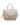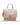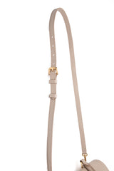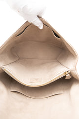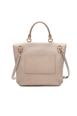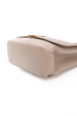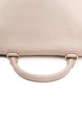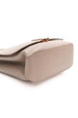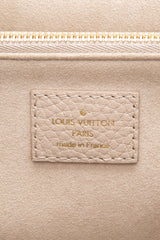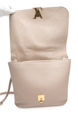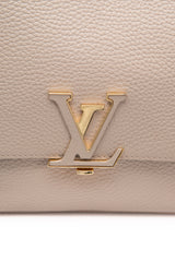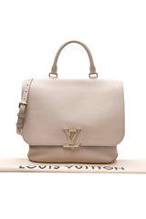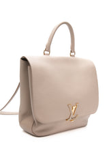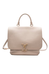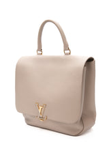 This handbag is crafted of grained calfskin leather in taupe. It features a leather top handle, removable adjustable crossbody strap, and a leather-covered LV logo on the front. The flap opens with a press lock to a partitioned taupe microfiber interior with a center zipper compartment and patch pockets.