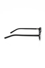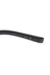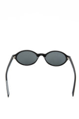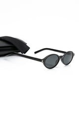 These sunglasses have a sleek, oval shape that recalls vintage '90s styles. They're made from black acetate, fitted with smoked lenses, and have the brand's logo subtly engraved along the arms.