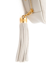 This chic shoulder bag is crafted of beautiful textured calfskin leather in crema soft. This features a cross-body strap, gold-tone hardware, and a decorative tassel zipper pull. The top zipper opens to a compact black leather interior with card slots.